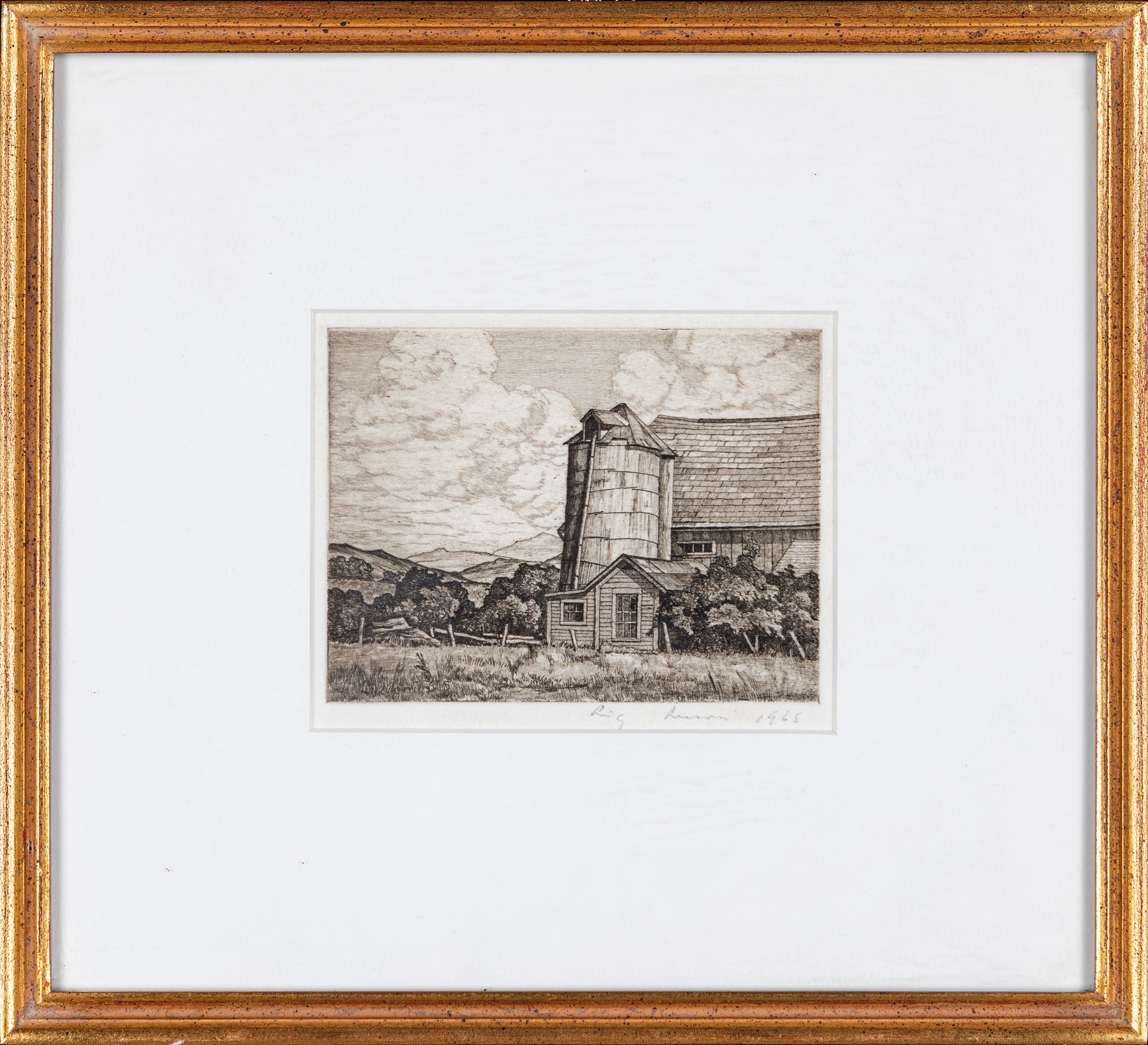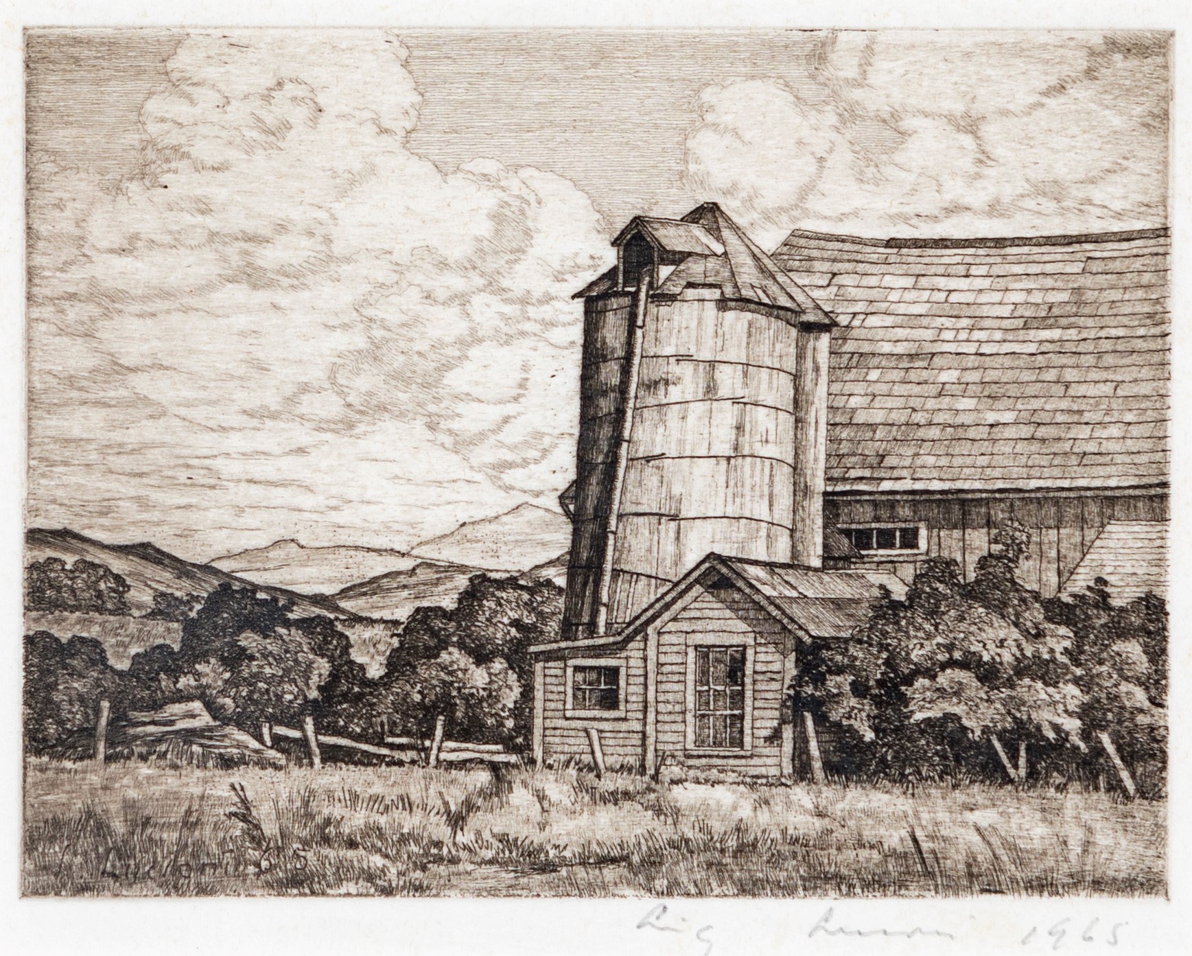 Paesaggio con granaio 1965 Acquaforte cm 11,5x14,5 lastra Firma e data "Luigi Lucioni 1965". Misure in cornice cm 31,5x34,5