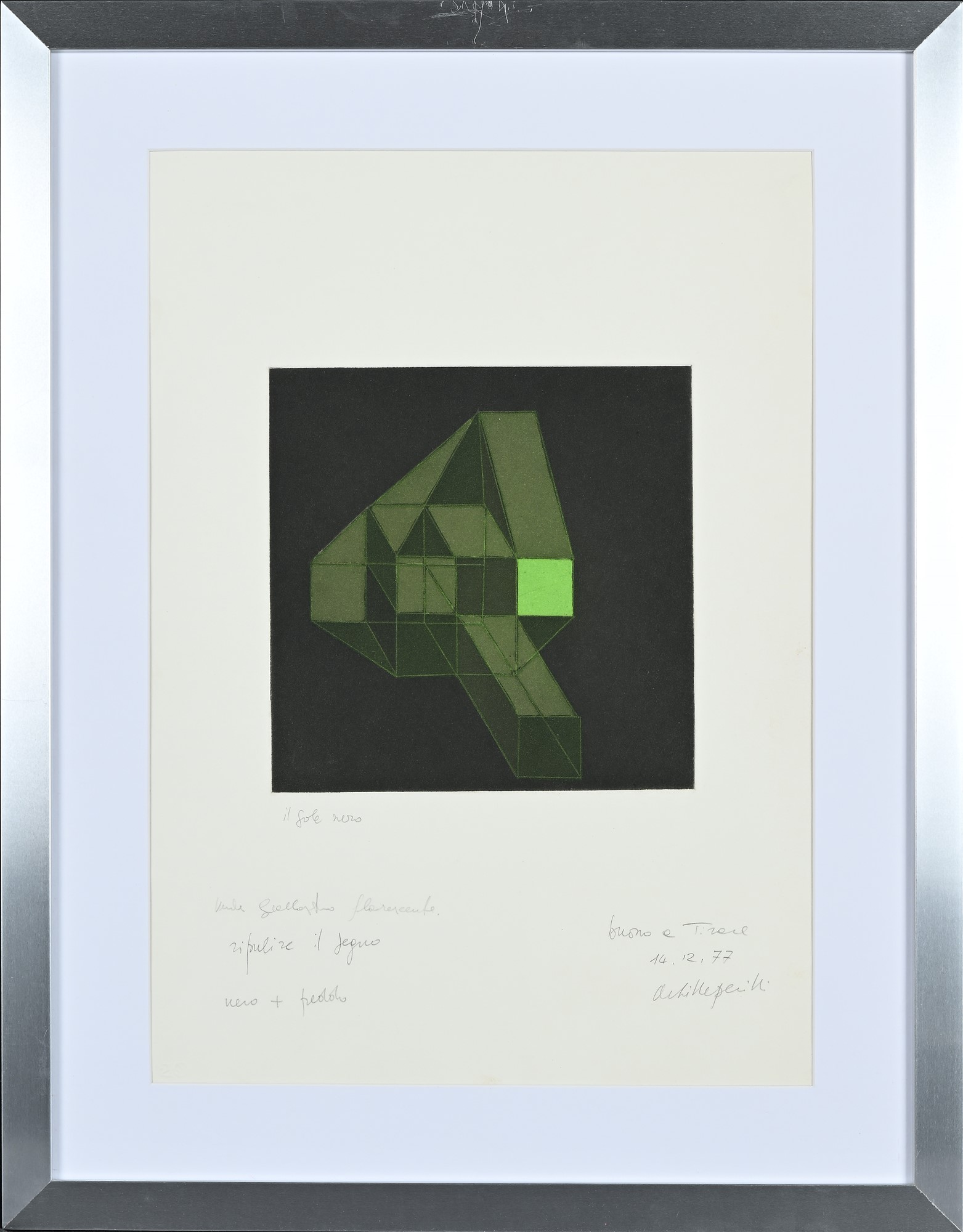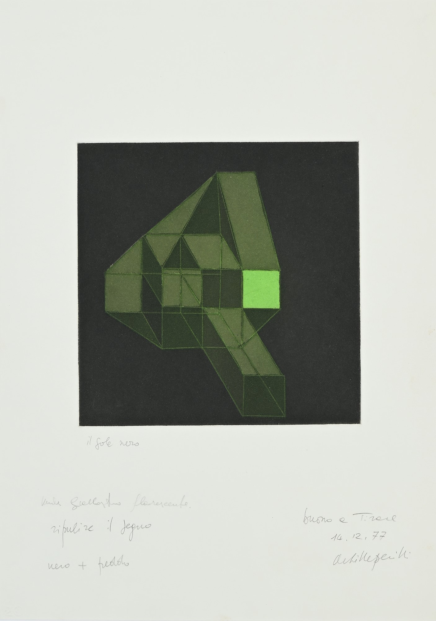 Il sole nero 1977 Acquaforte/acquatinta cm 50x35 - in cornice cm 63x50 Sul fronte a matita "Il Sole Nero, Buono a tirare, 14.12.77, Achille Perilli / Un Giallastro Fluorescente / ripulire il segno / nero + freddo".