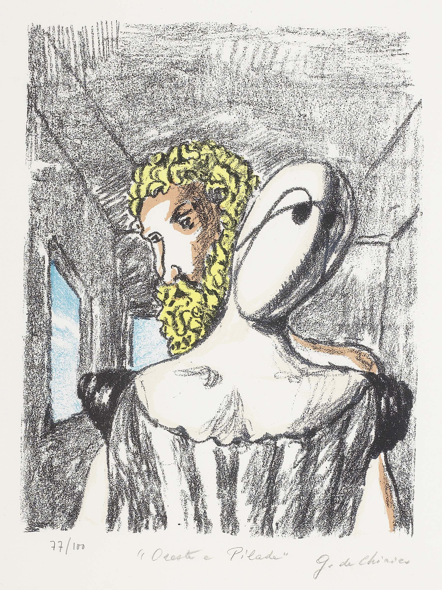 Giorgio de Chirico Volos 1888 - Roma 1978 Oreste e Pilade, 1970 Litografia a colori, es. 77/100, cm. 29x22,5 (lastra), cm. 50,5x35 (carta) Tiratura, titolo e firma in basso: 77/100 "Oreste e Pilade" G. de Chirico. Tiratura di 100 esemplari più 15 prove d'artista. Bibliografia: Edoardo Brandani, Giorgio de Chirico. Catalogo dell'opera grafica 1969-1977, Edizioni Bora, Bologna, 1990, p. 140, n. 117.