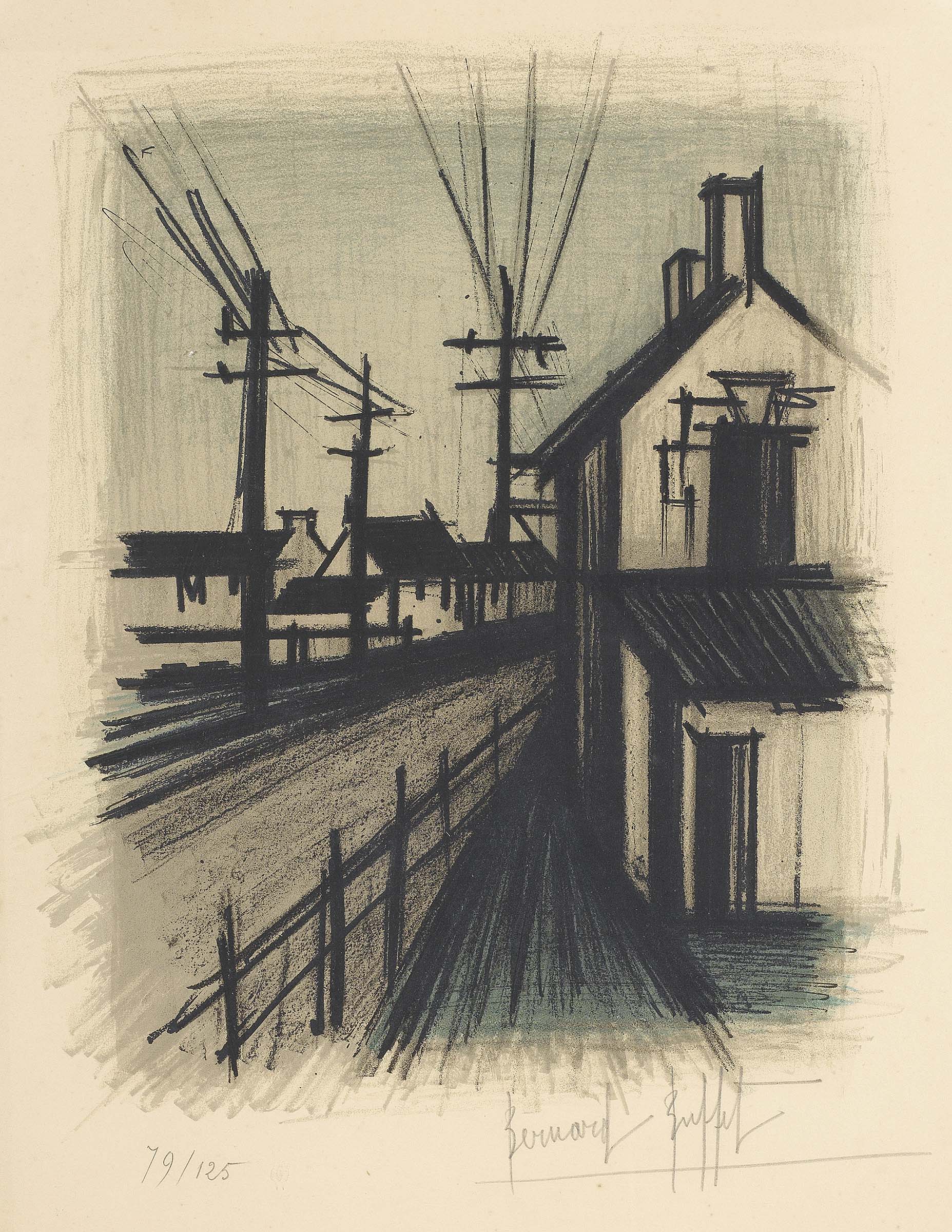 Bernard Buffet Parigi 1928 - Tourtour 1999 La route du village Litografia a colori, es. 79/125, cm. 57,5x44,6 Firma a matita sul margine in basso a destra: Bernard Buffet, tiratura in basso a sinistra: 79/125.