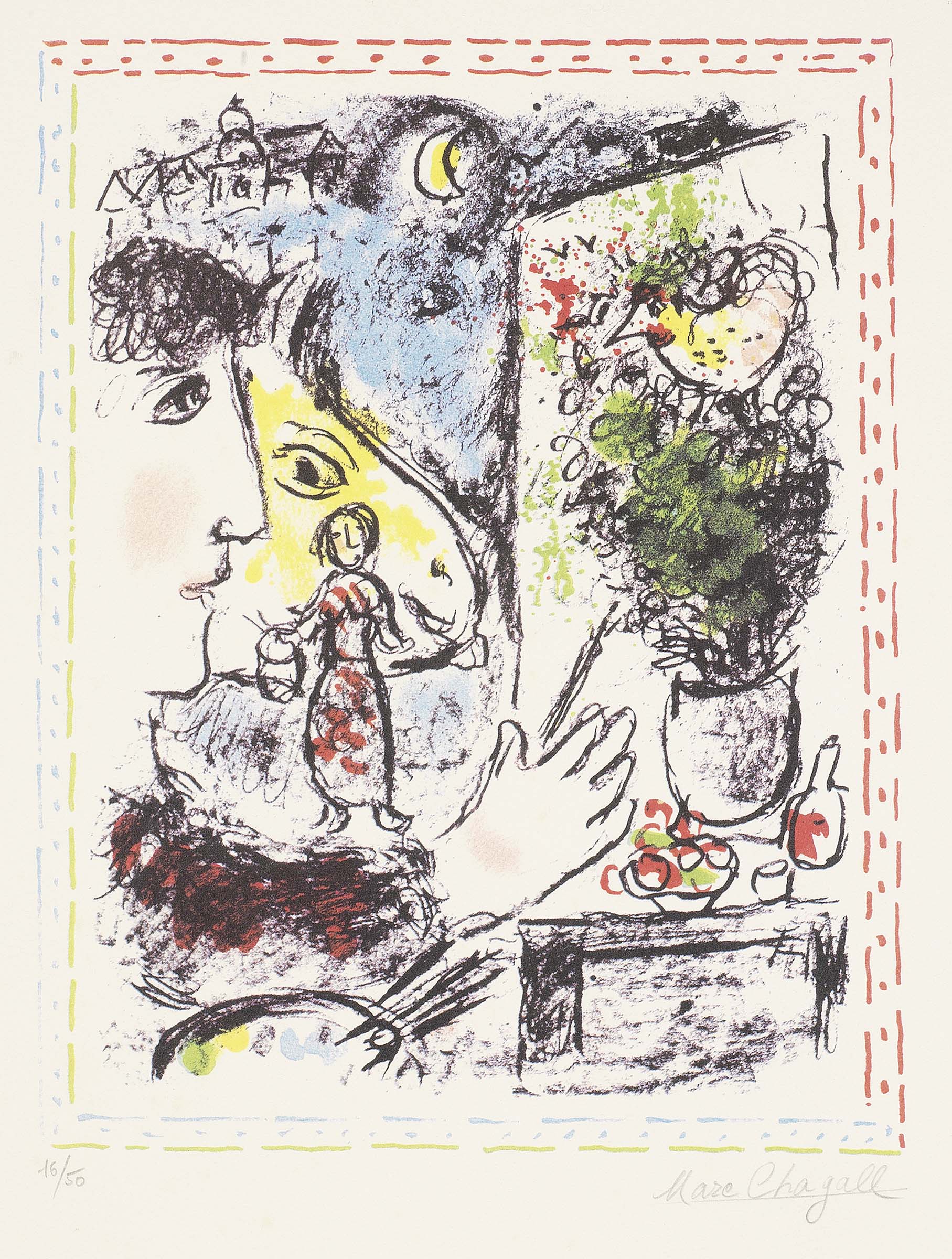 Marc Chagall Vitebsk 1887 - Saint Paul de Vence 1985 Monde familier, 1983 Litografia a colori, es. 16/50, cm. 35x27 (lastra), cm. 54x42,5 (carta) Firma a matita sul margine in basso a destra: Marc Chagall, tiratura in basso a sinistra: 16/50. Tiratura di 50 esemplari su carta Arches, numerati e firmati; 12 esemplari in nero numerati e firmati, riservati all'artista. Bibliografia: Charles Sorlier, Chagall lithographe VI, 1980-1985, Édition André Sauret, Monte-Carlo, 1986, p. 102, n. 1015; Marc Chagall. The Lithographs. La collection Sorlier, catalogo della mostra, Stuttgart, Staatsgalerie, 19 settembre 1998 - 10 gennaio 1999, poi Hamburg, Deichtorhallen, 18 febbraio - 9 maggio 1999, Verlag Gerd Hatje, 1998, p. 375, n. 1015.