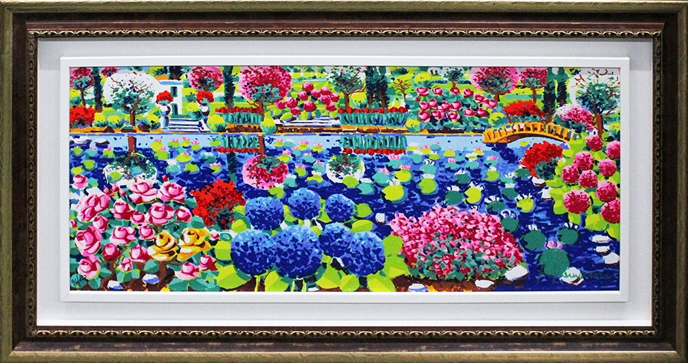 ATHOS FACCINCANI, "Romantico ponte sul laghetto di ninfee", serigrafia polimaterica a 36 passaggi di colore, 36x84, tiratura in 150 esemplari, esemplare 94/150. Al fronte: firma in basso a destra e tiratura in basso a sinistra. Al verso: nome autore, titolo, tecnica, misura, tiratura, firma al centro
