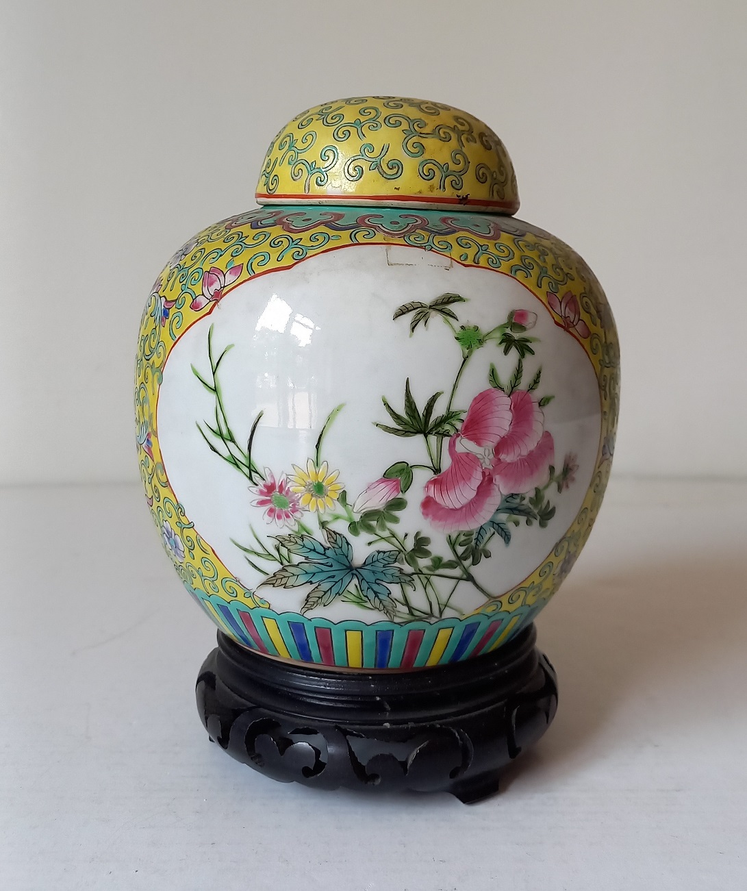 POTICHE ORIENTALE IN PORCELLANA DECORATA IN POLICROMIA CON BASE IN LEGNO H.CM.18
