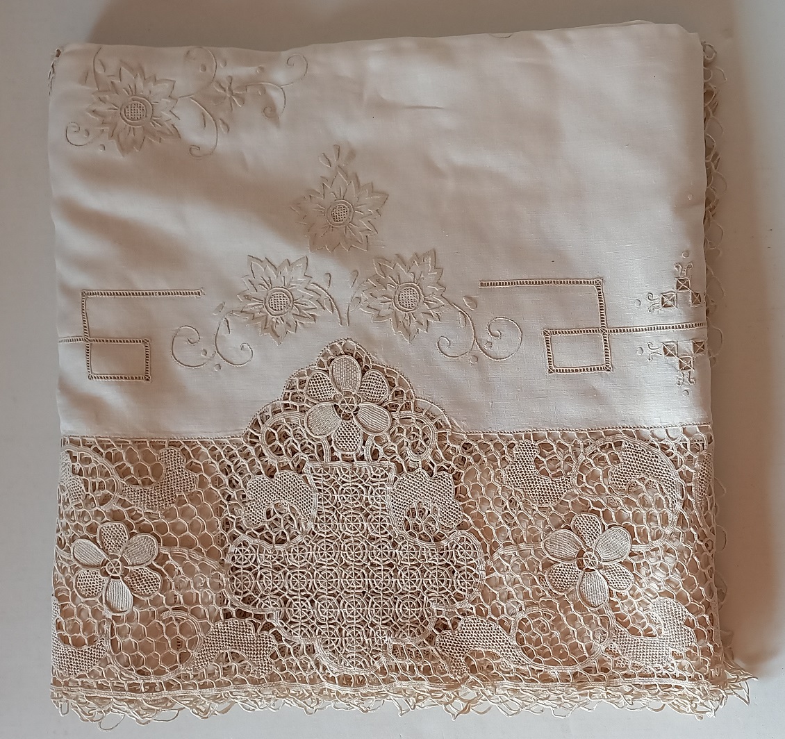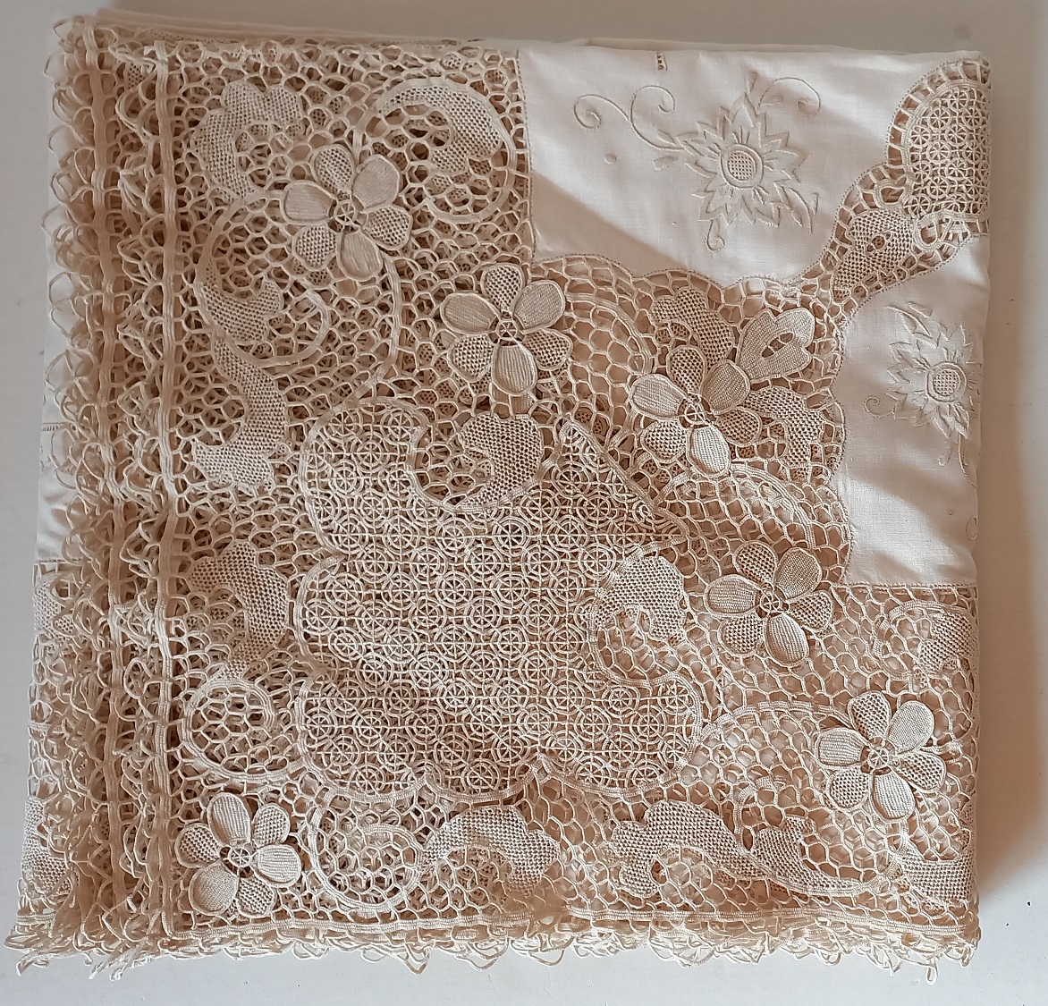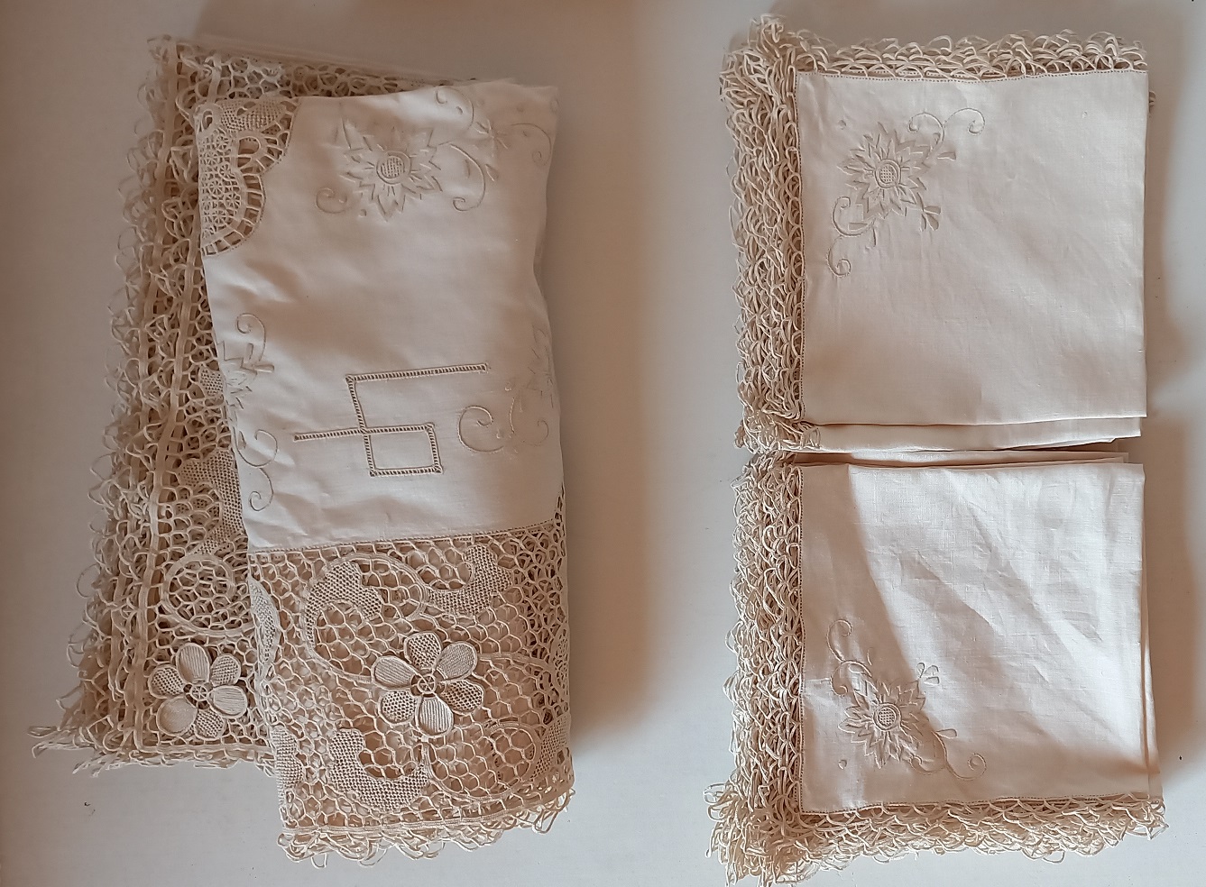 Lotto 131 | TOVAGLIA E DODICI TOVAGLIOLI IN TESSUTO DI LINO CON RICAMI E APPLICAZIONI...