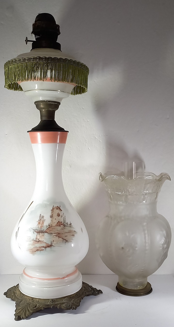 Lotto 148 | LUME A PETROLIO IN VETRO BIANCO DECORATO E METALLO H.CM.56 - PARALUME IN...