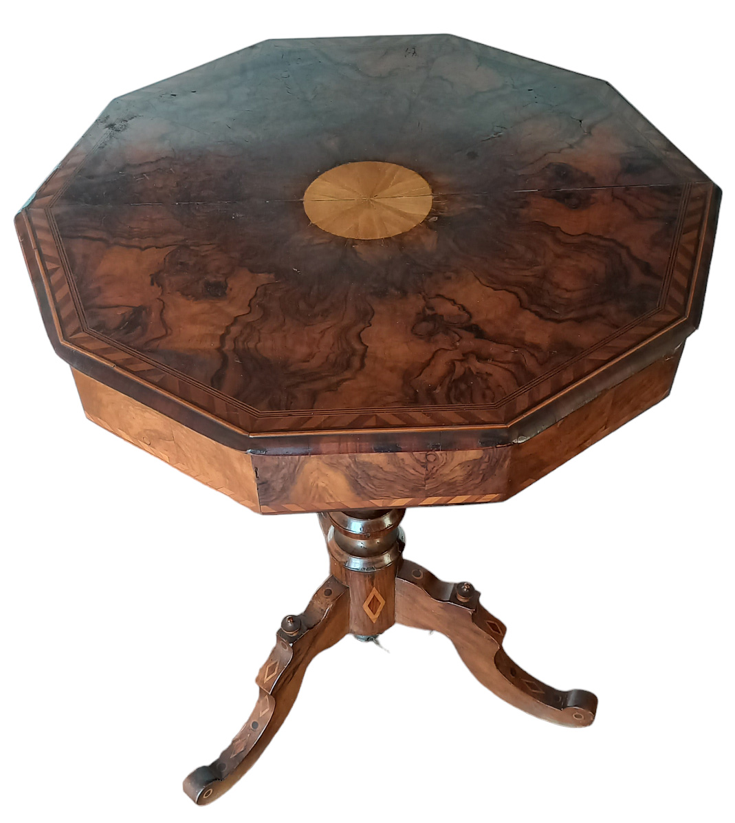 TAVOLINO DECAGONALE LASTRONATO IN RADICA DI NOCE E INTARSIATO CM.61X65 H.CM.79 XIX SECOLO - DIFETTI