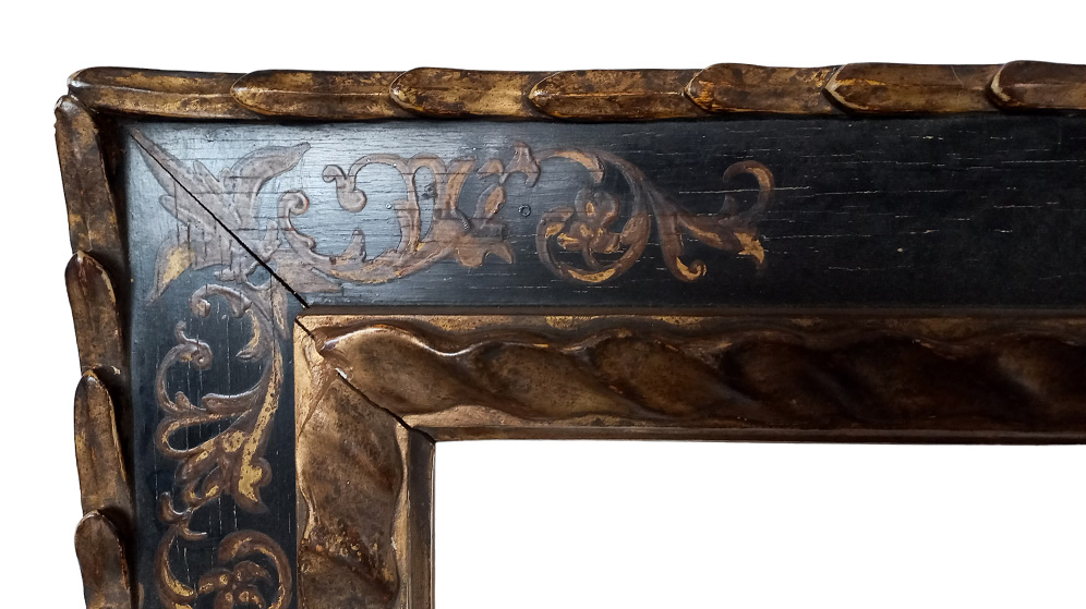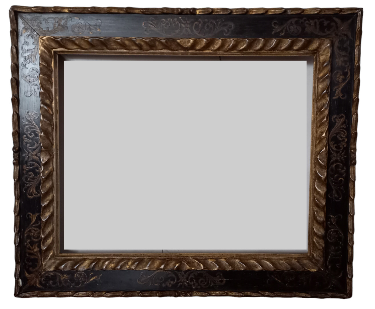 ANTICA SPECCHIERA IN LEGNO INTAGLIATO EBANIZZATO DECORATO IN ORO E STUCCO...