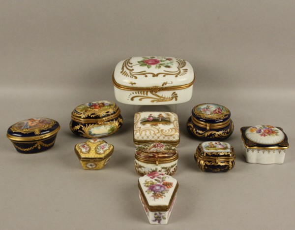 Dieci scatolette portapillole in porcellana decorata. Di varie forme e misure. Fine XIX-inizi XX secolo.