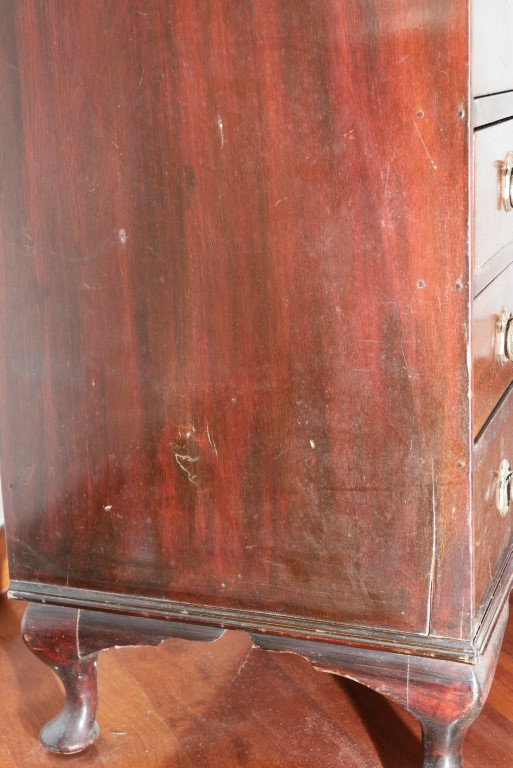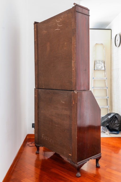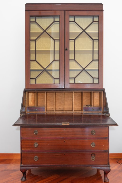 parte superiore con due sportelli a vetri, ribalta con scarabattolo e vani a giorno, tre cassetti sottostanti, base modanata, gambe mosse