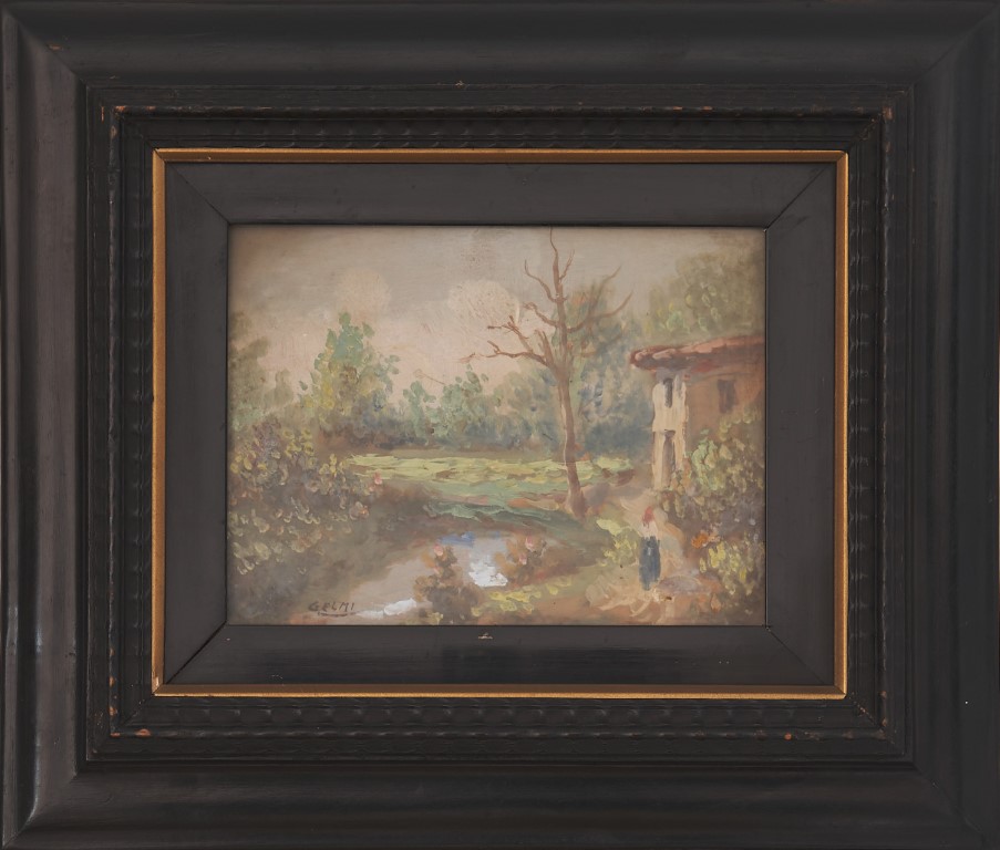 Pittore impressionista della fine del XIX secolo - inizio del XX secolo, Veduta di paesaggio con torrente, albero e abitazione