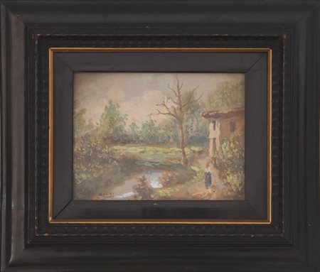 Lotto 97 | Pittore impressionista della fine del XIX secolo - inizio del XX secolo, Veduta di paesaggio con torrente, albero e abitazione