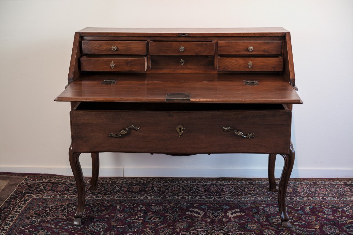 sportello a ribalta con scarabattolo interno con sei cassettini, un cassetto sottostante, pendaglina sagomata, gambe sinuose su piedi a zoccolo equino
