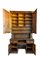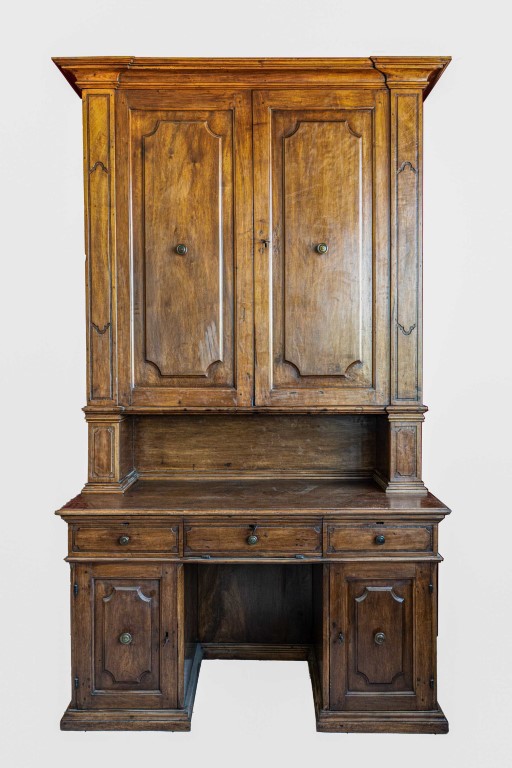 a doppio corpo, parte superiore con cornice modanata, due sportelli scorniciati e vano interno a palchetti e scomparti a giorno, due cassetti segreti nel basamento; parte inferiore con piano con becco di civetta, due cassetti ed uno sportello sotto al piano e due sportelli scorniciati laterali sottostanti, base modanata