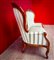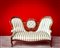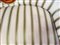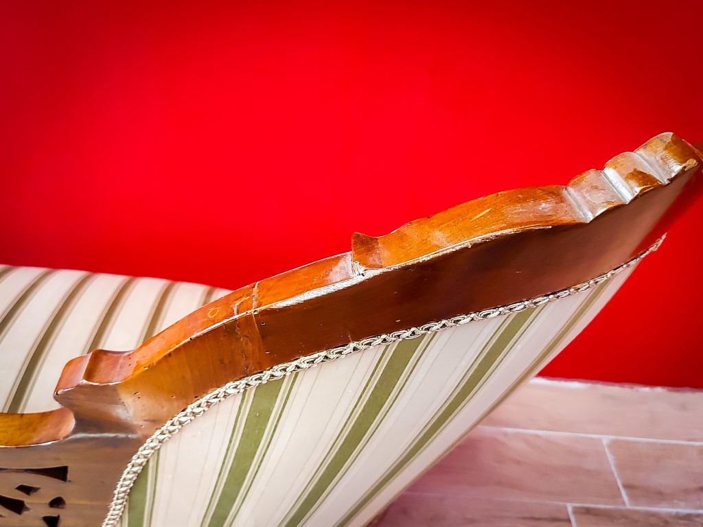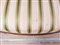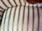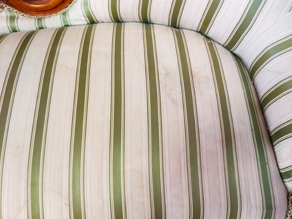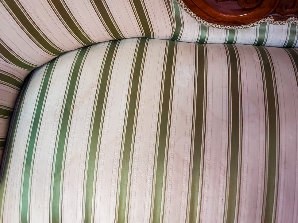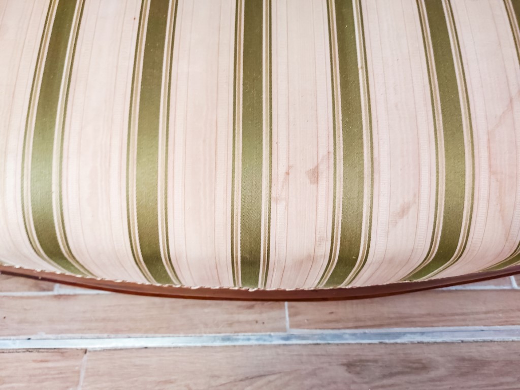 schienale ad onda centrato da intarsio, imbottito e rivestito in tessuto rigato verde salvia e avorio, parte centrale capitonnè, gambe mosse