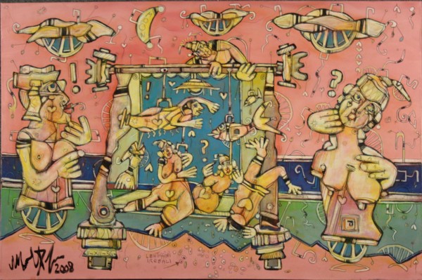 DELEGO MARTINO - Nato a Genova nel 1956. Vive e lavora a Milano. Acrilico su tela intitolato ''TEATRO DELLE ILLUSIONI''. Firmato in basso a sinistra. Con autentica dell'artista su fotografia. Mis. Lung. cm. 120 Alt. cm. 80 ca.