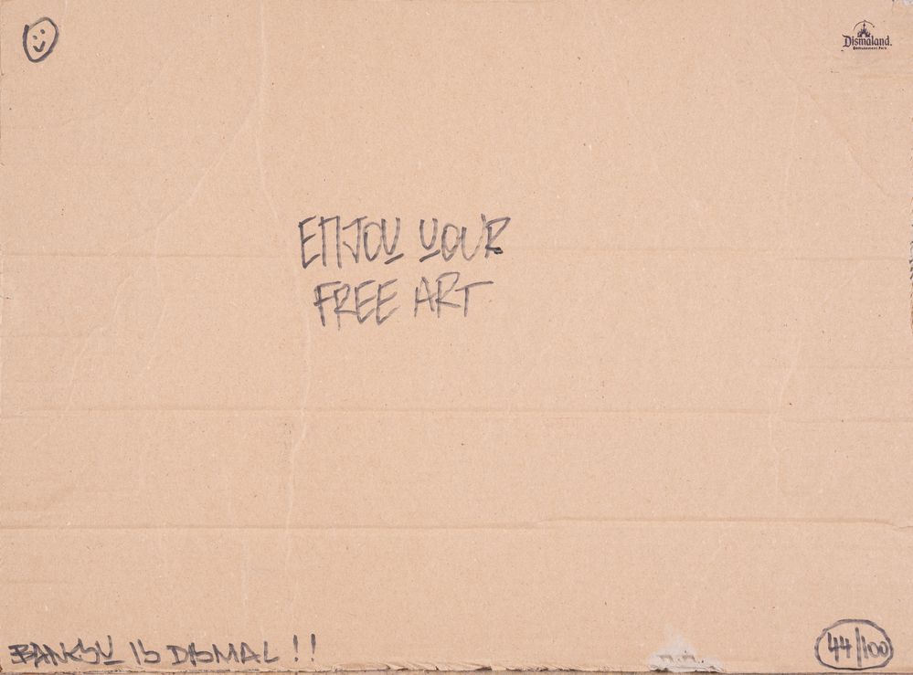 BANKSY (Bristol 1974) "Bazooka Mona Lisa". Spray su cartone. Cm 36,5x49,5. Al retro reca numeri di tiratura 44/100. Al retro reca timbro Dismaland. Opera accompagnata da ticket d'ingresso a Dismaland.