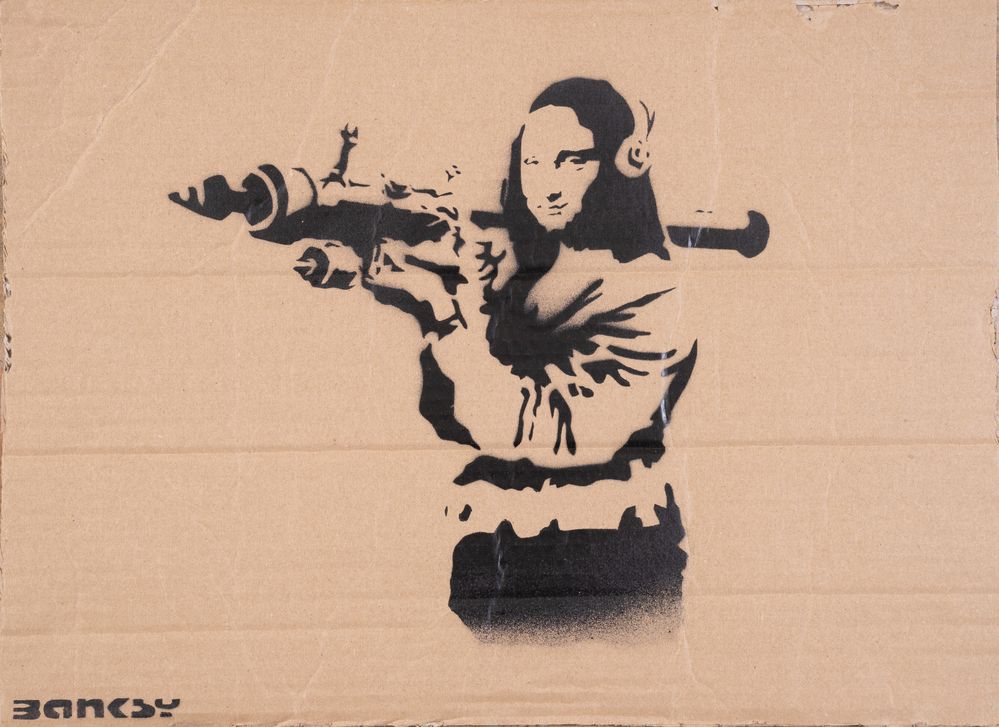 BANKSY (Bristol 1974) "Bazooka Mona Lisa". Spray su cartone. Cm 36,5x49,5. Al...