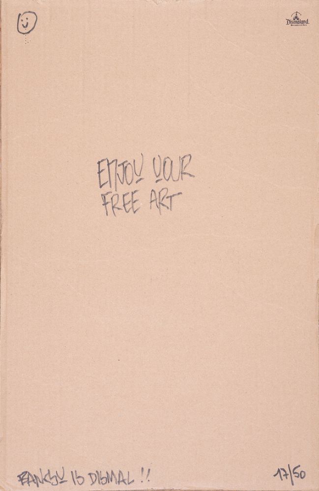 BANKSY (Bristol 1974) "Cosmic Scaphandre girl". Spray su cartone. Cm 57,5x37,5. Al retro reca numeri di tiratura 17/50. Al retro reca timbro Dismaland. Opera accompagnata da ticket d'ingresso a Dismaland.