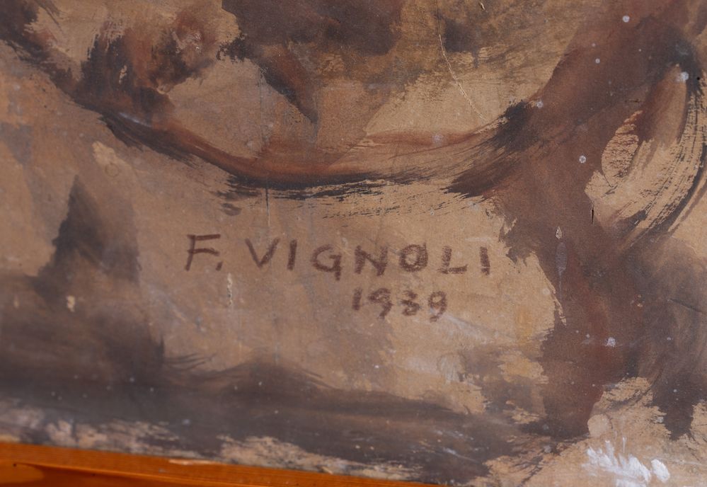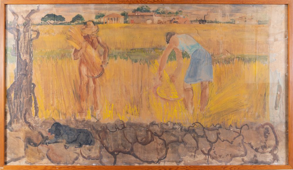 FARPI VIGNOLI (Bologna 1907 – 1997) "Mietitura", 1939. Acquerello e tempera su carta. Cm 97,5x178. Opera firmata e datata in basso a destra F. Vignoli 1939.