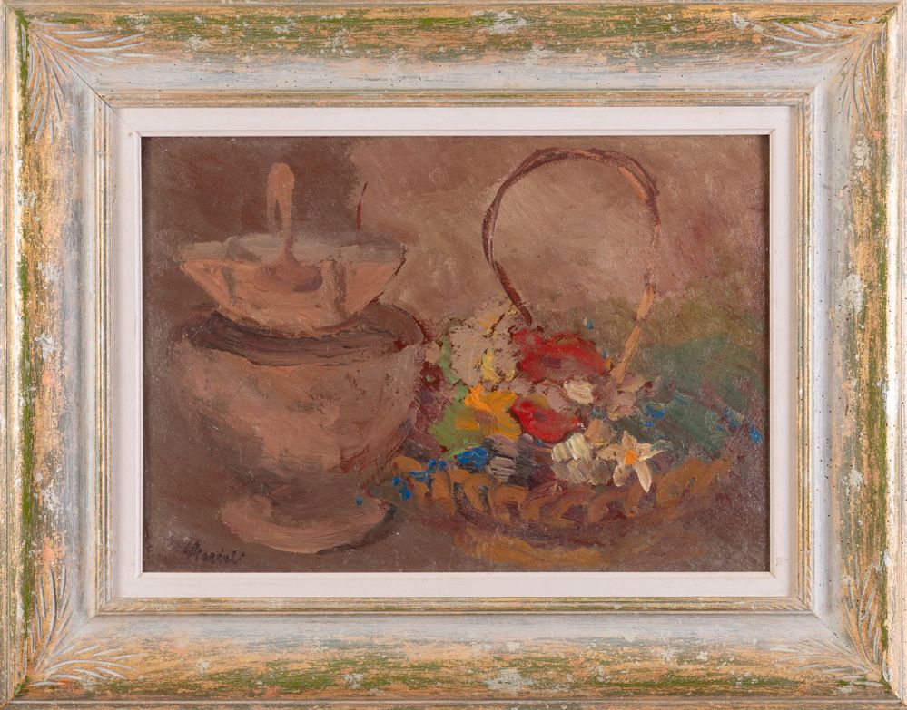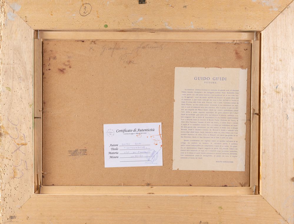 GUIDO GUIDI (1941) "Composizione". Olio su faesite. Cm 30x40. Opera firmata in basso a sinistra G Guidi. A retro presenta etichetta della Galleria d'arte Lo Zodiaco, con timbro e firma, come certificato di autenticità.