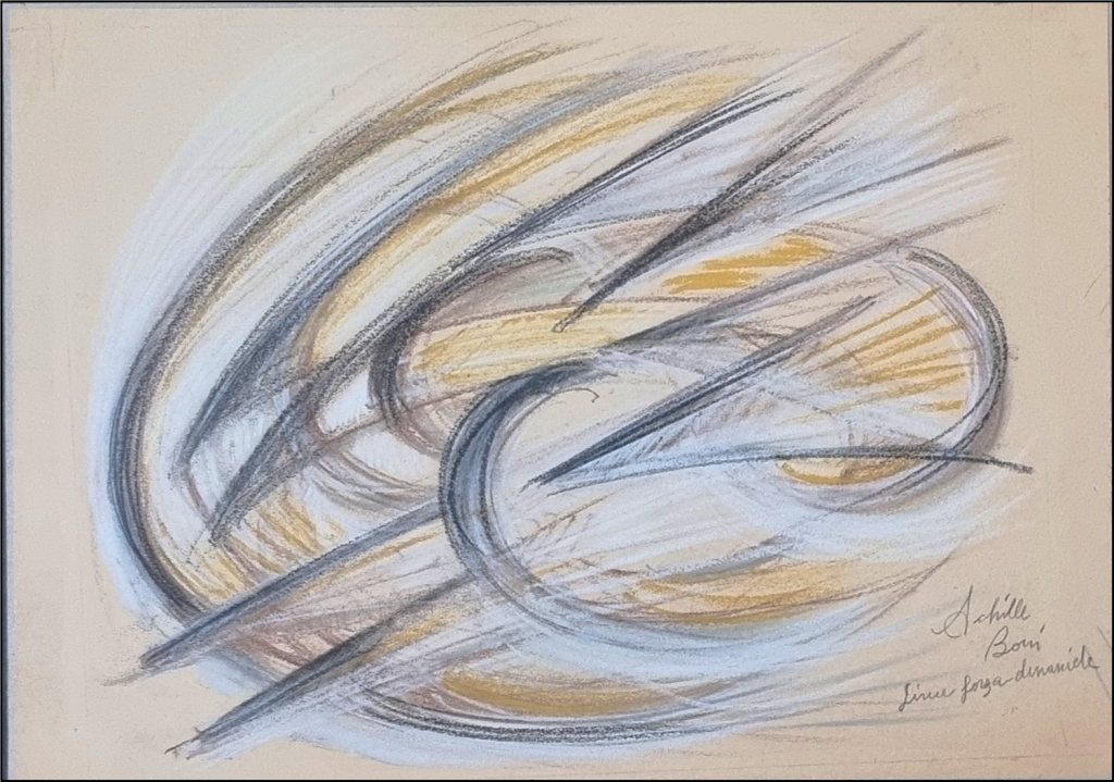 BONI ACHILLE Italia XX sec. "Linee forza - dinamiche" Tecnica mista su cartone cm 31x22. Firmata ed intitolata sul fronte in basso a destra. Certificato di provenienza di altra casa d'aste. Opera incorniciata.