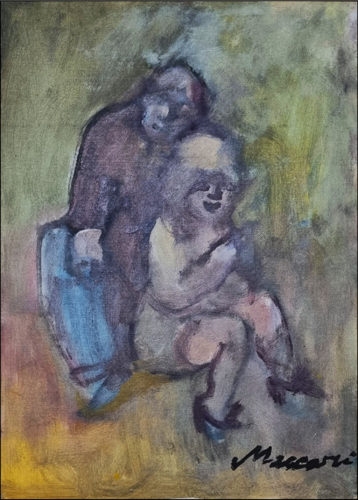 MACCARI MINO Siena 1898 - Roma 1989 "Corteggiamento" Olio su cartone telato cm 25x35. Firmato sul fronte in basso a destra. Archivio a cura di Marco Maccari, con conferma notarile del Dott. Torrisi, Viareggio 1993.