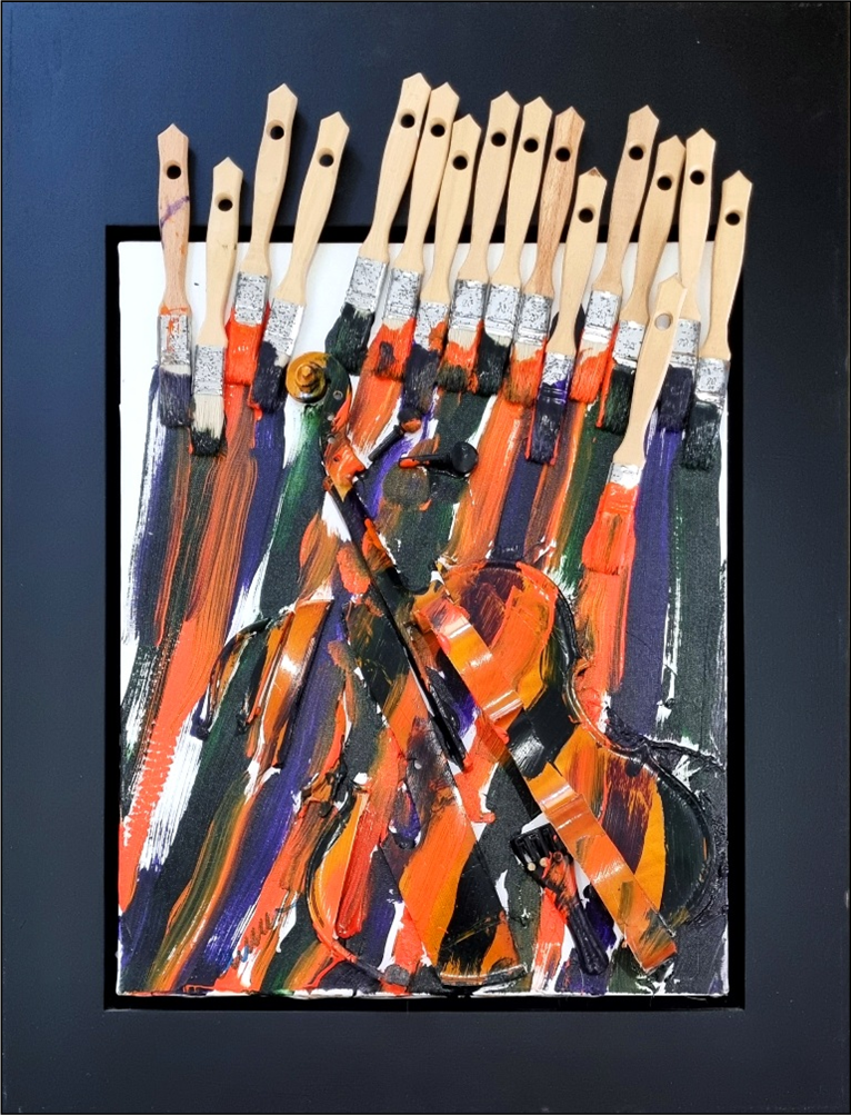 FERNANDEZ ARMAN - ARMAND PIERRE Nizza 1928 - New York 2005 "Pennelli e violino" Pennelli e violino tagliato applicati su tela, con pittura acrilica nera, viola, arancione e verde, cm 60,5x42x10,5. Opera firmata sul fronte in basso a sinistra. Autentica ed archivio su foto a cura della Dante Vecchiato.
