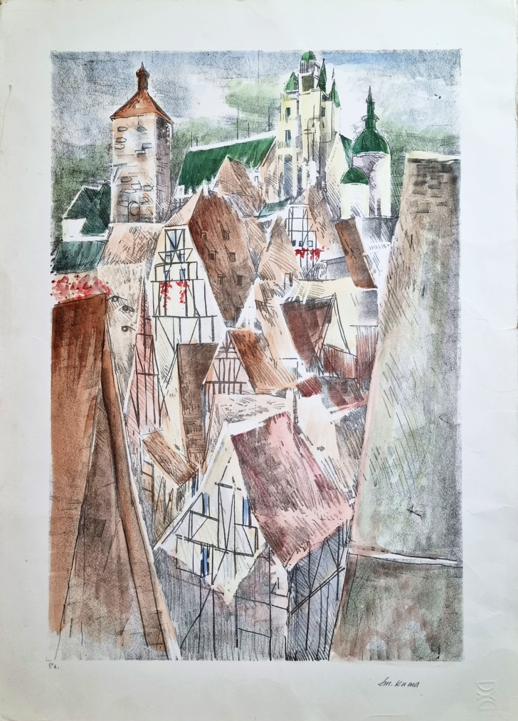 KUMAMOTO MASAYOSHI Giappone XX sec. "Il ponte" Litografia acquerellata a mano su cartoncino, cm 39x60 del 1979. Firmata sul fronte in basso a destra, tiratura P.A. a sinistra. Certificato di garanzia e autenticità a cura di Edizioni d'Arte Angolare.