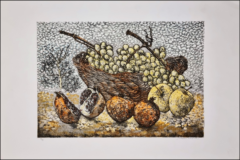 MOSCA MARIO Osimo (AN) 1940 "Natura morta" Acquatinta acquerellata a mano, cm 49x34 del 1981. Firmata sul fronte in basso a destra, tiratura 58/99 a sinistra. Certificato di autenticità a cura di Edizioni d'Arte Angolare.