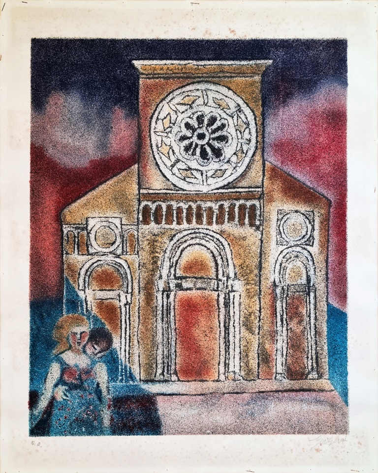 GENTILINI FRANCO Faenza 1909 - Roma 1981 "Cattedrale d'amore" Litografia su cartoncino cm 40x50 del 1978. Firmata sul fronte in basso a destra, tiratura E.A. a sinistra. Certificato di autenticità a cura della Galleria Angolare. (Presenta fioriture).