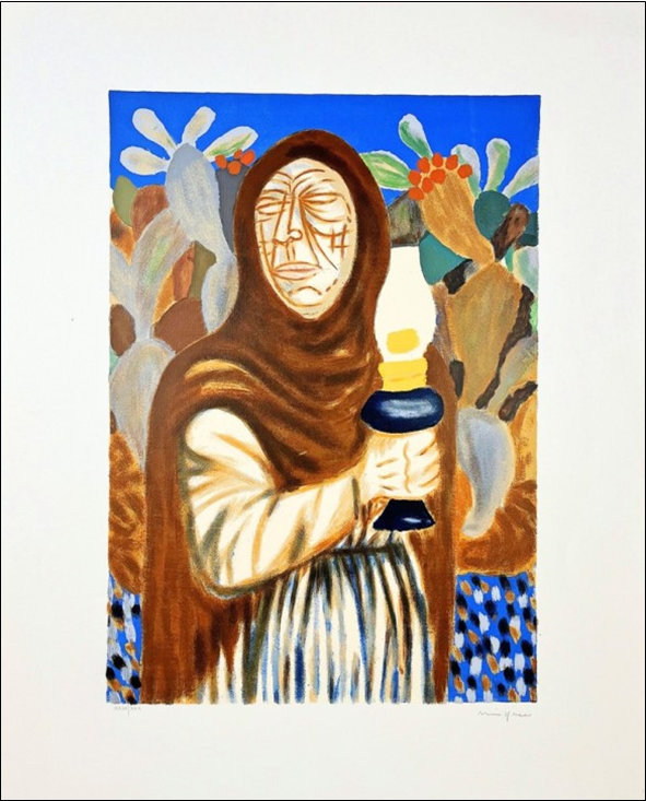 MIGNECO GIUSEPPE Messina 1903 - Milano 1997 "Donna con lume tra i cactus" Serigrafia su carta cm 65x80. Firmata sul fronte in basso a destra, tiratura a sinistra.