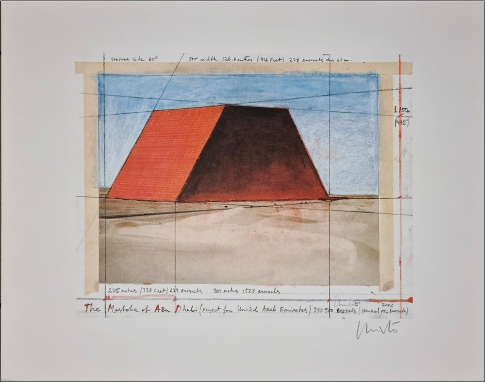 CHRISTO JAVACEV Bulgaria 1935 - New York 2020 "The Mastaba of Abu Dhabi - Project for the United Arab Emirates" Litografia su cartoncino cm 50x40. Firmata a matita sul fronte in basso a destra, esemplare 353. Certificato di autenticità a cura di Edition Art Olimpique.