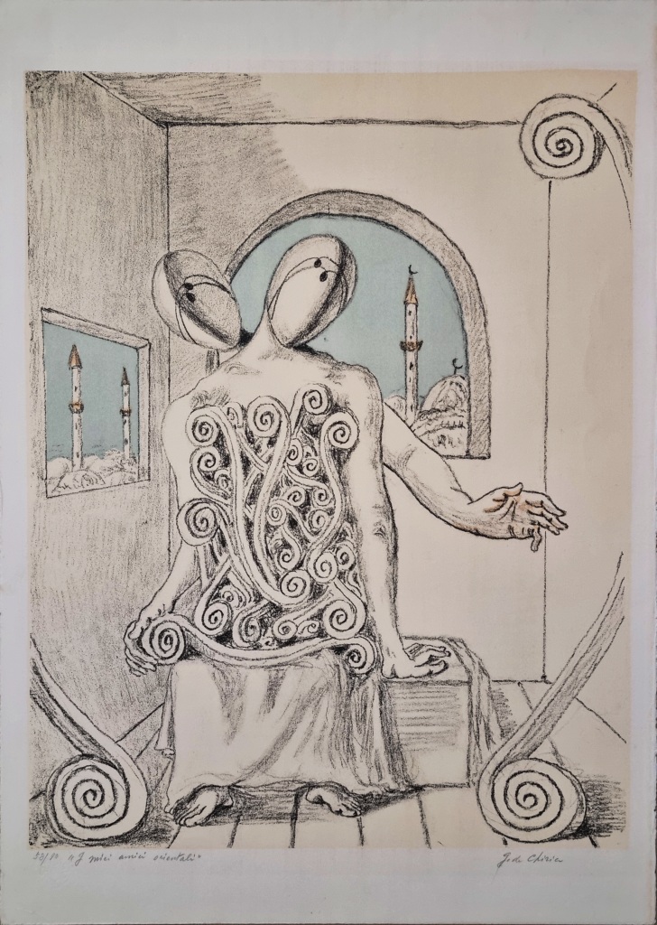 DE CHIRICO GIORGIO Grecia 1888 - Roma 1978 "I miei amici orientali" Incisione serigrafica cm 48x62. Firmata sul fronte in basso a destra, titolo, timbro a secco e tiratura 58/90 a sinistra.