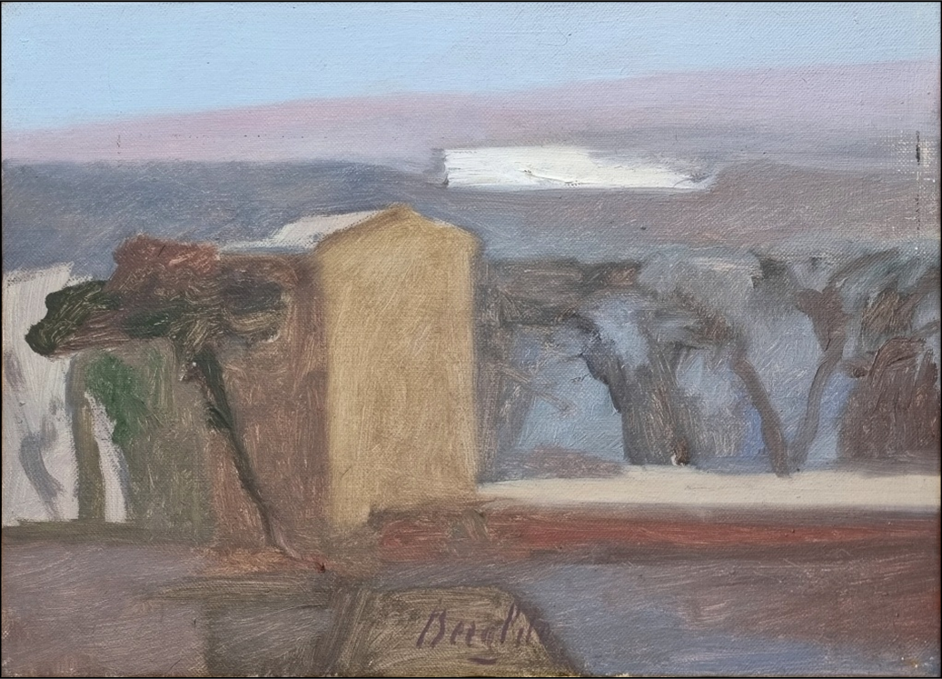 BERALDO FRANCO Meolo 1944 "Paesaggio" Olio su tela cm 35x25. Firmato sul fronte in basso a destra, firma e numero di archivio al retro. Dichiarazione di autenticità dell'Artista, su foto.