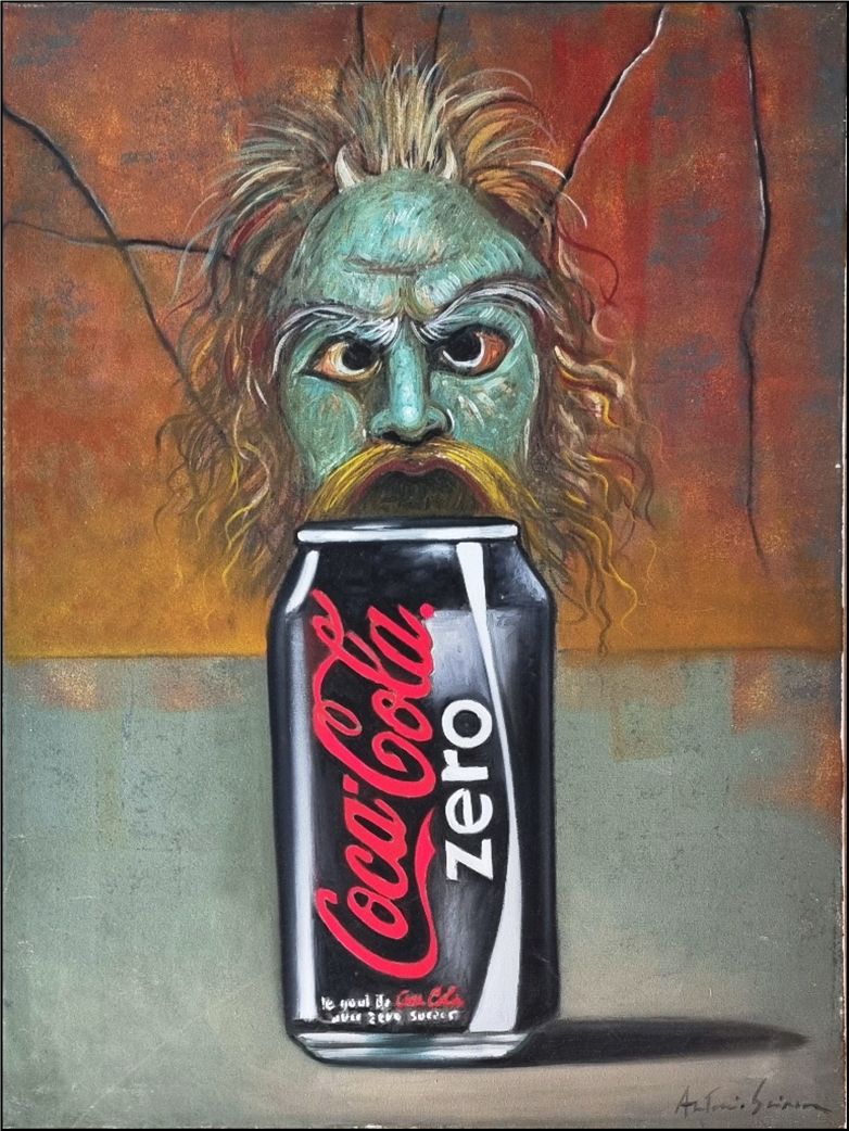 SCIACCA ANTONIO Catania 1957 "Coca Cola zero" Olio su tela cm 60x80 del 2020. Firmato sul fronte in basso a destra. Sul retro titolo e firma per autentica. Opera archiviata.