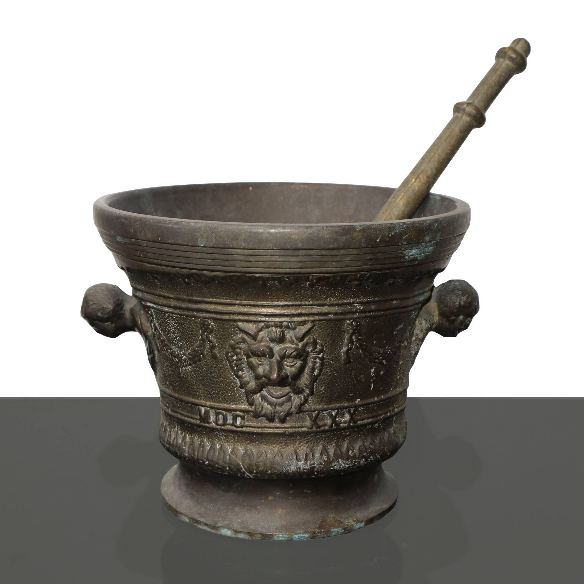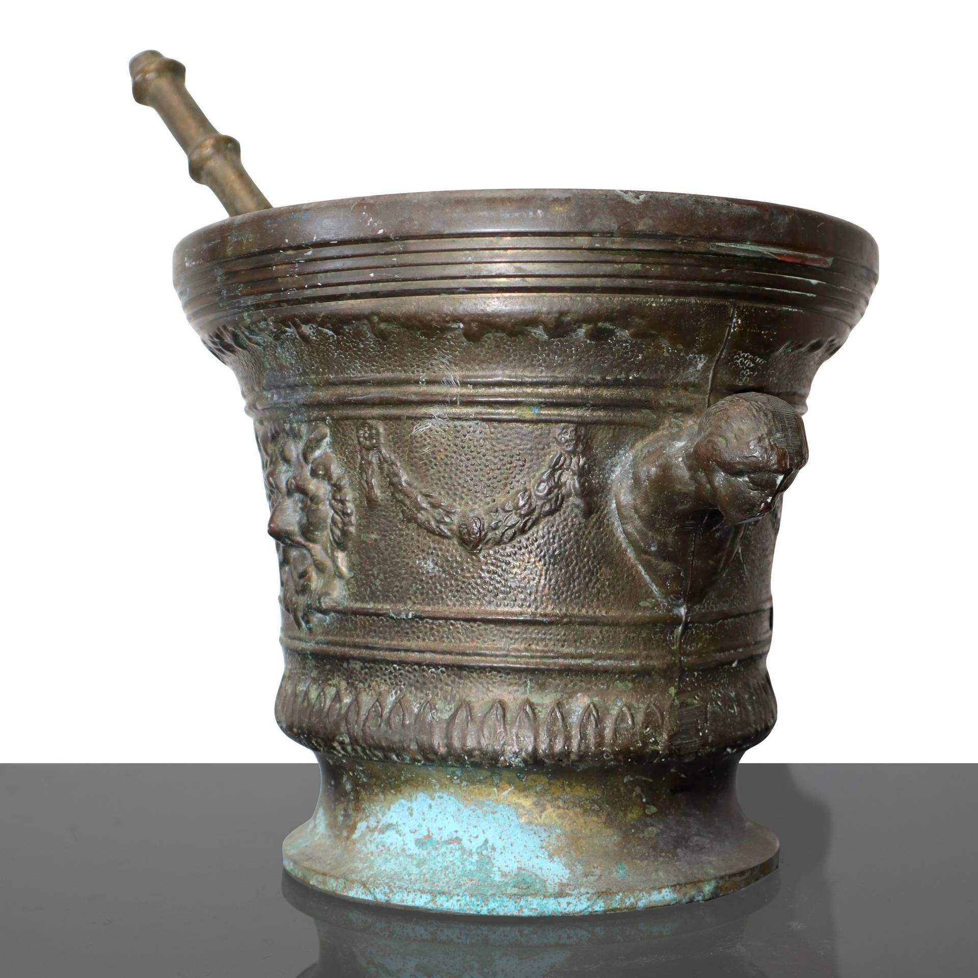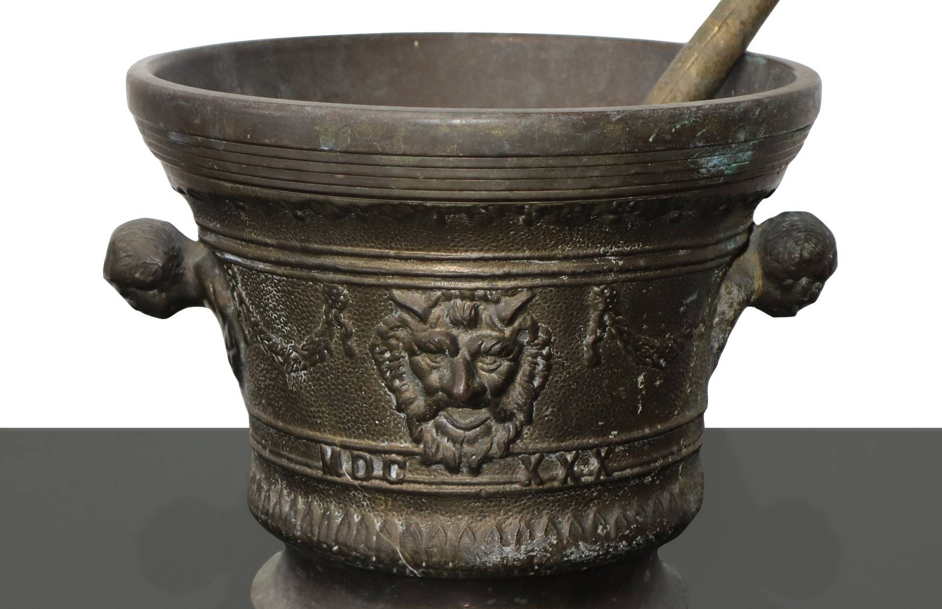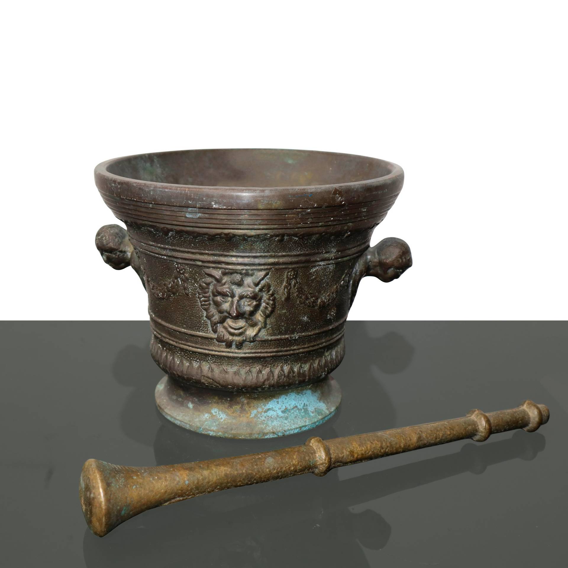 Mortaio in bronzo con Pestello, nineteen° secolo H cm 20, bocca cm 24 Prese con decorazioni di teste d'uomoPrese con de