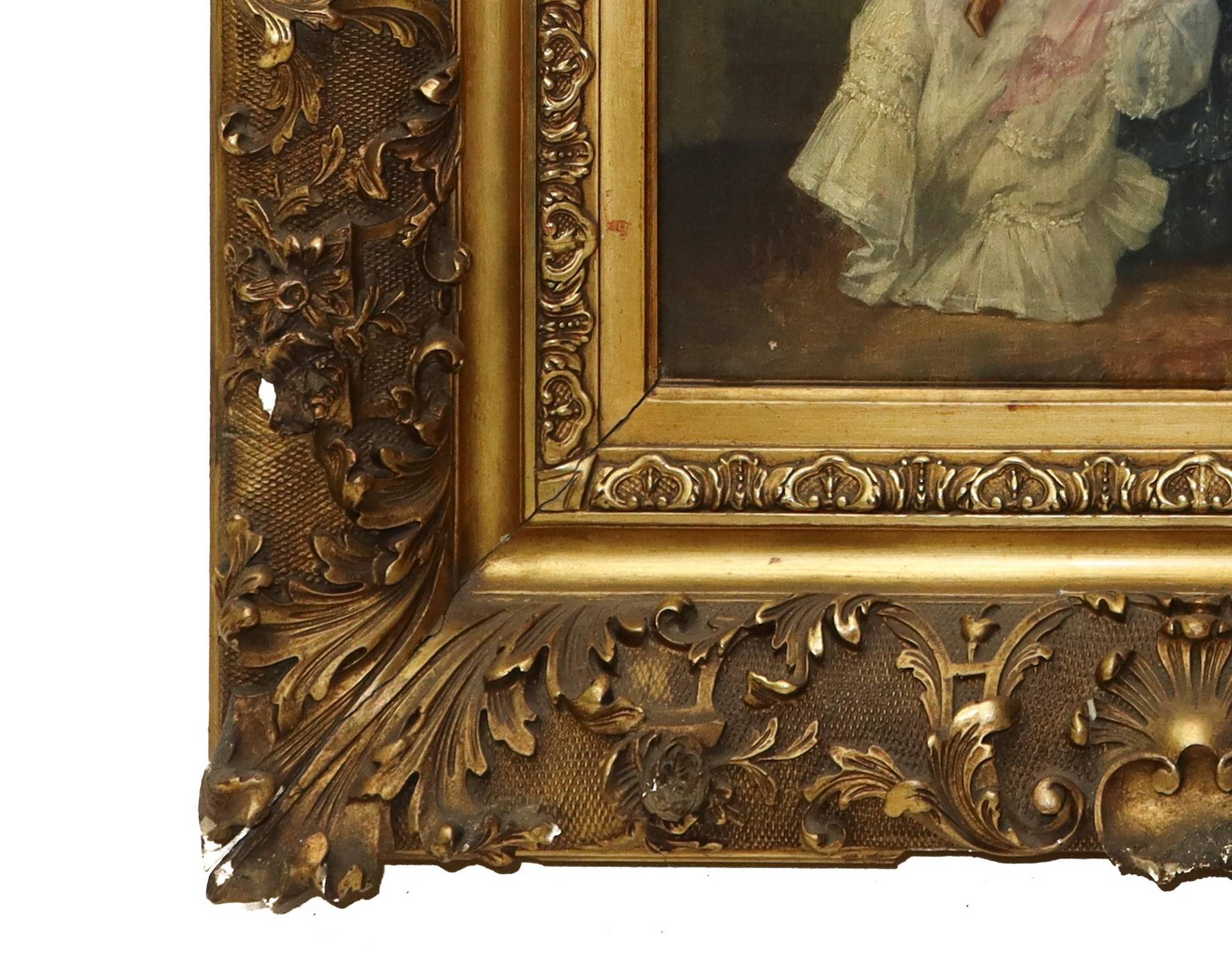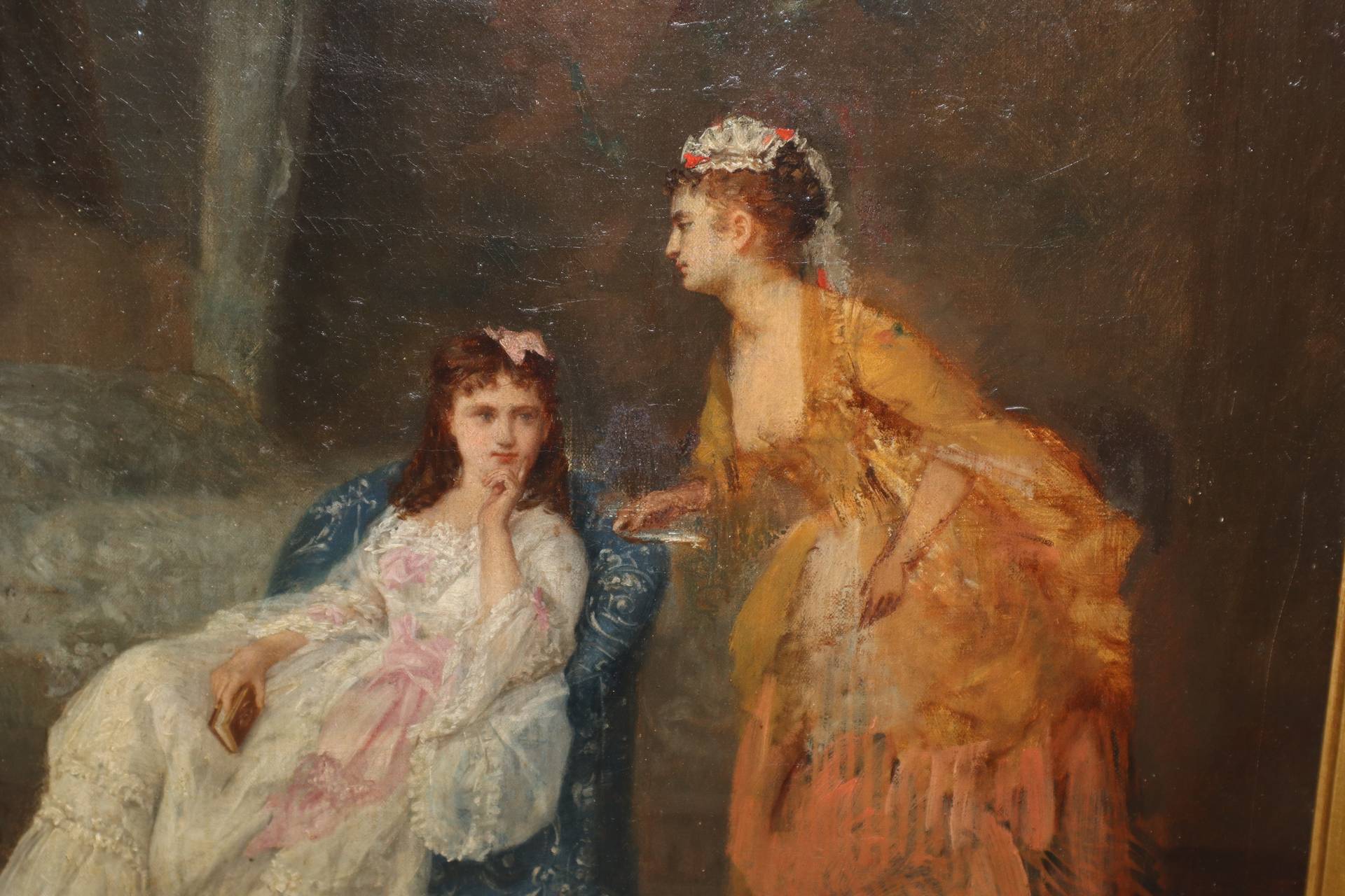 Scena di dame in un interno, nineteen° secolo cm 46.5x38.5, in cornice cm 75x66 Dipinto ad olio su tela