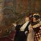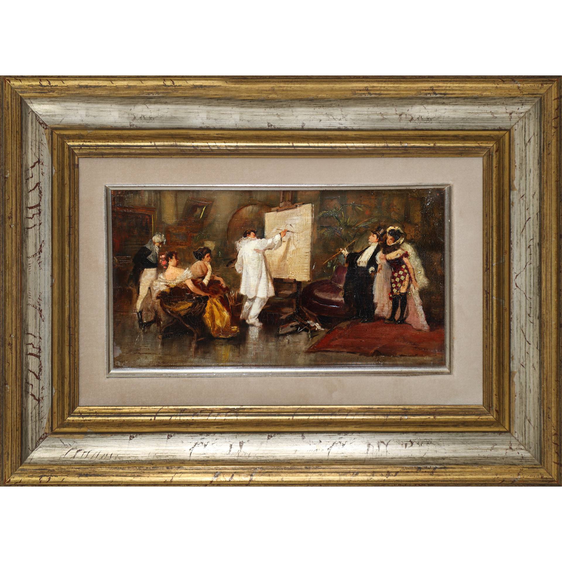 Pittore che dipinge un quadro con astanti, nineteen° secolo cm 18,5x32 in cornice cm 35x49 Olio su tavola