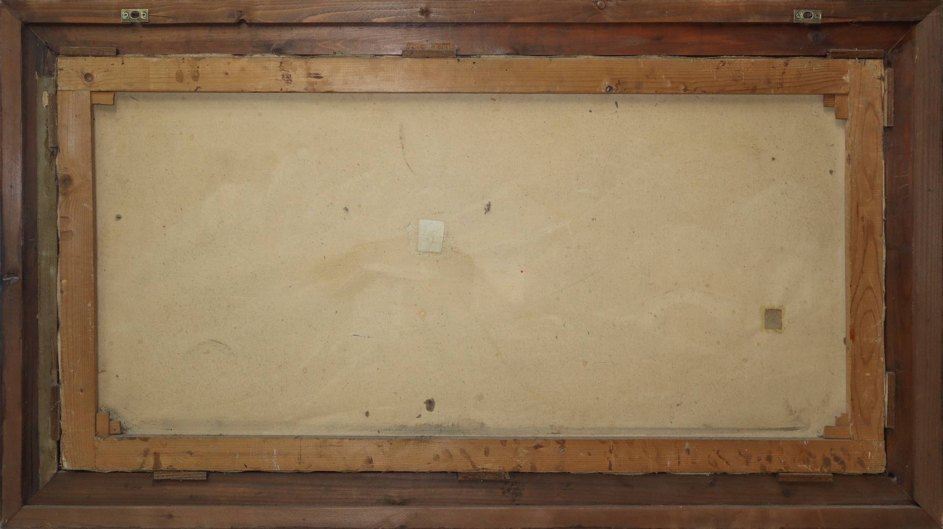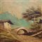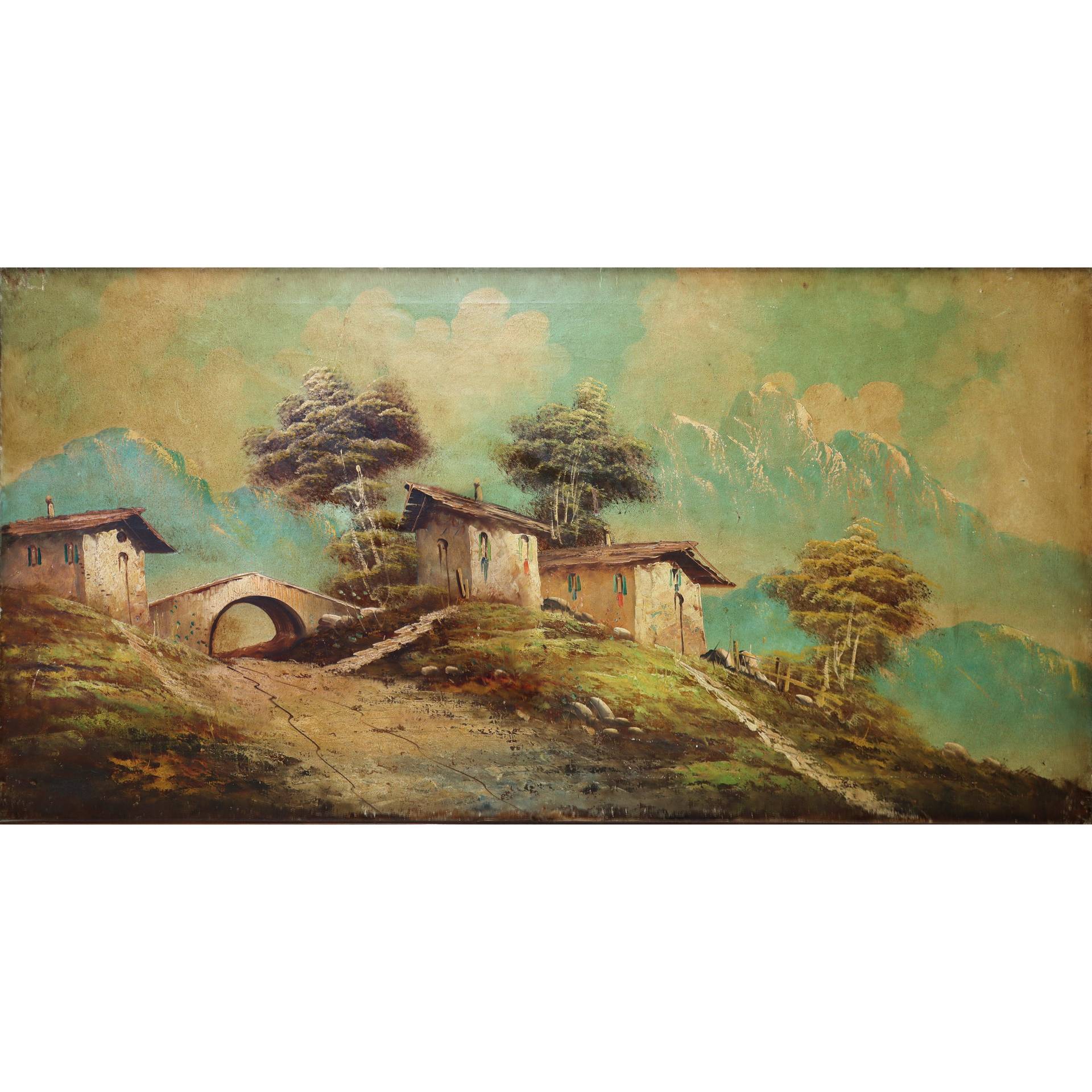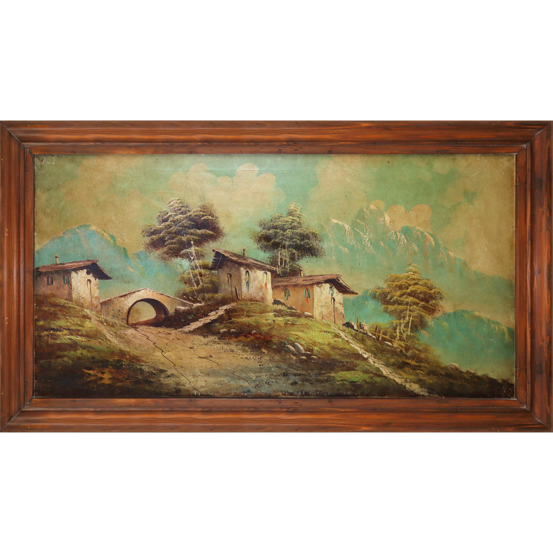 Paesaggio con casa rurale, ponte e montagne innevate, fine 19° secolo H cm 60x120 - in cornice H cm78x138 Olio su tela