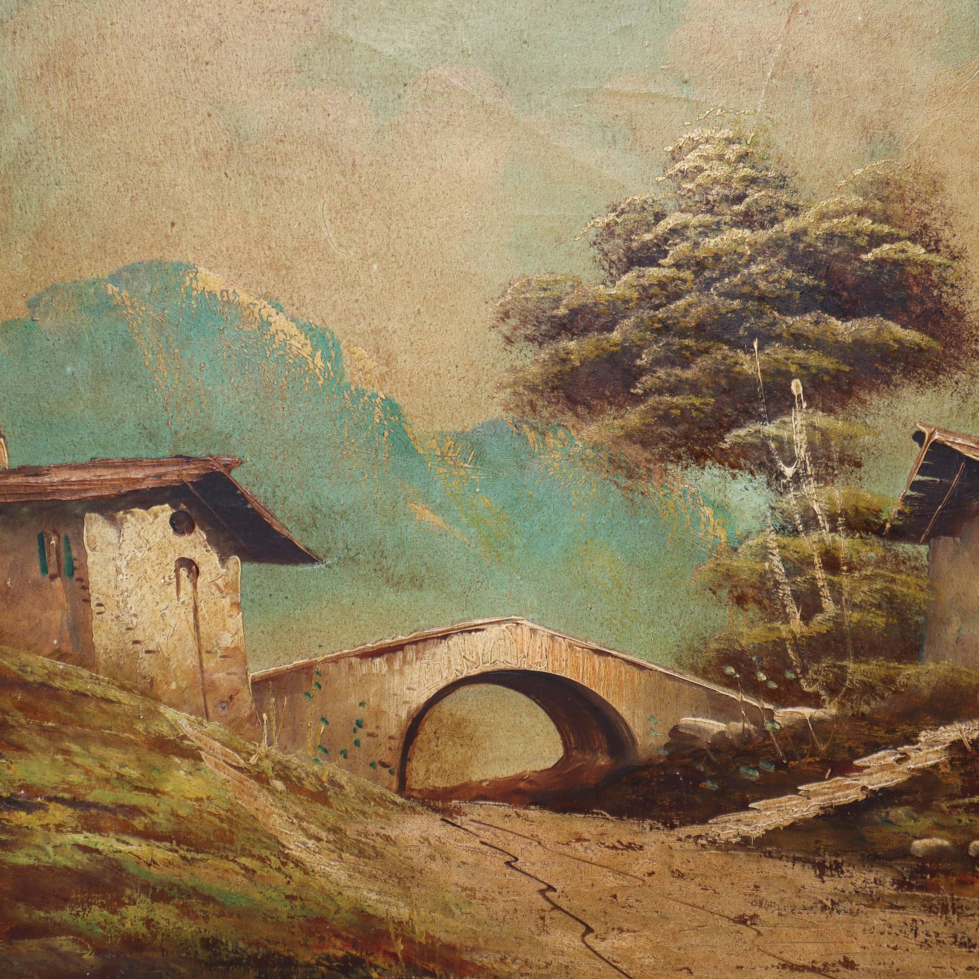 Paesaggio con casa rurale, ponte e montagne innevate, fine 19° secolo