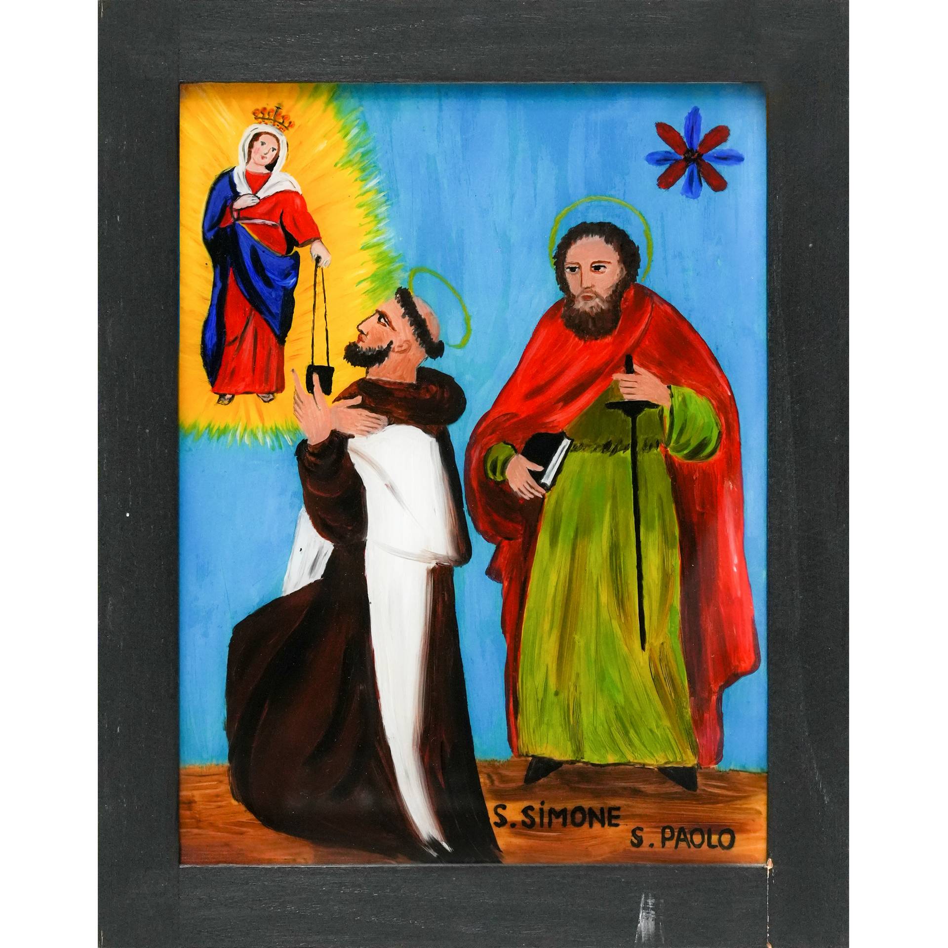 Santi Simone e Paolo davanti alla Madonna, 20° secolo H cm 27x20,5 - in cornice H cm 33,5x26,8 Pittura su vetro