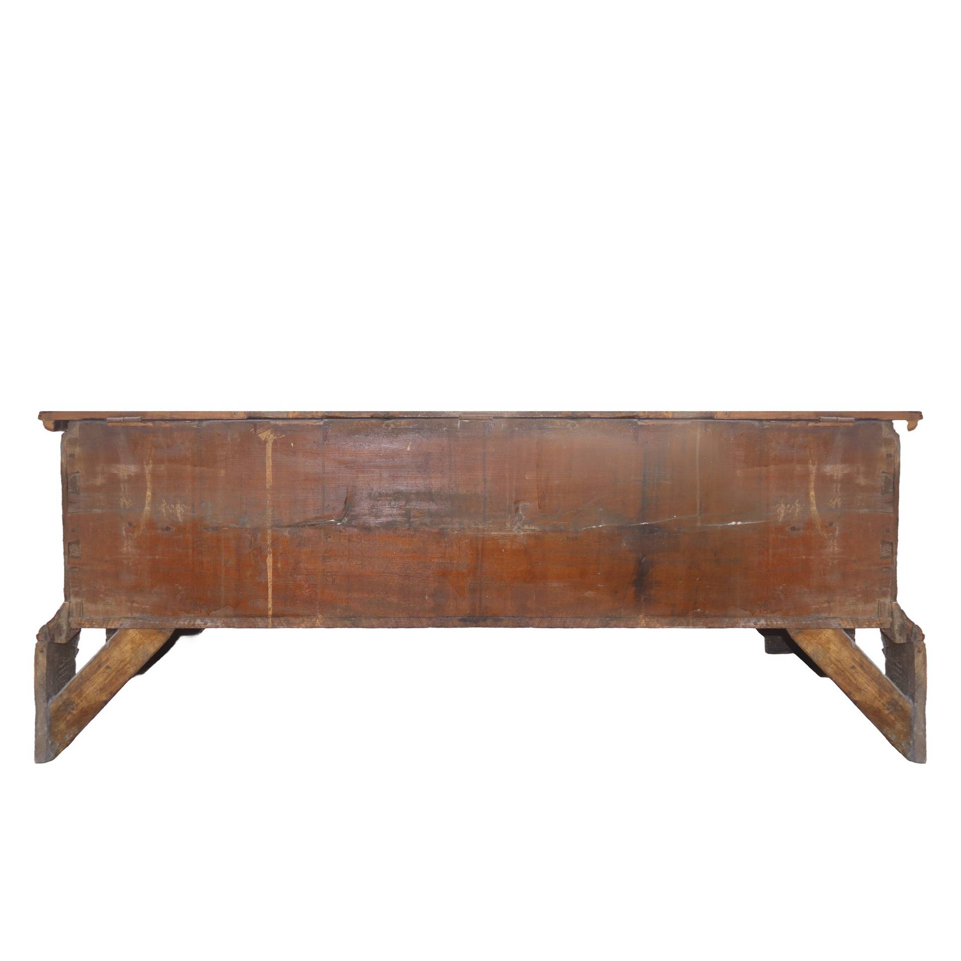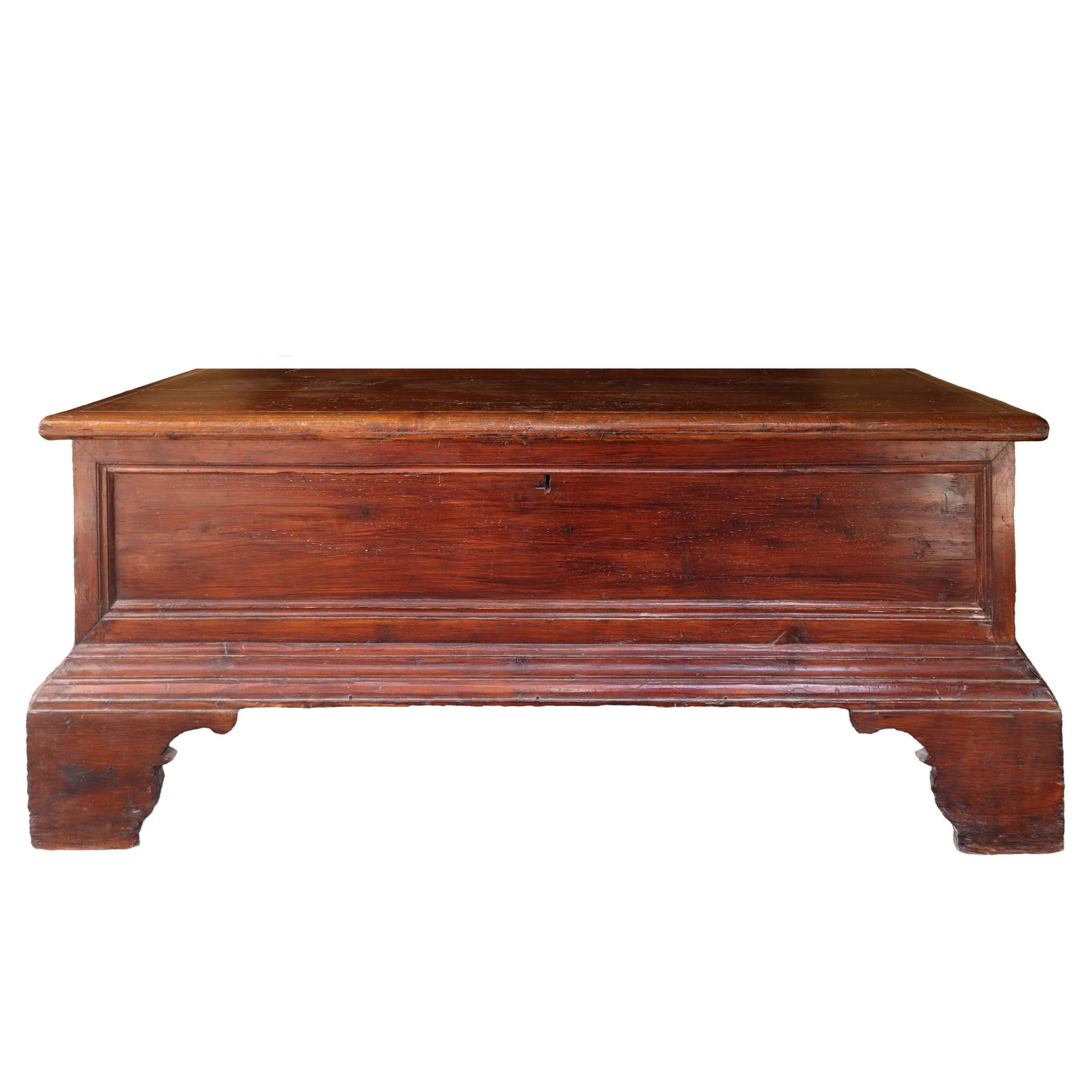 Cassapanca in legno di abete, nineteen° secolo H cm 72x175x65 Coperchio con bordi a bacucco, cornici a degradare, piedi