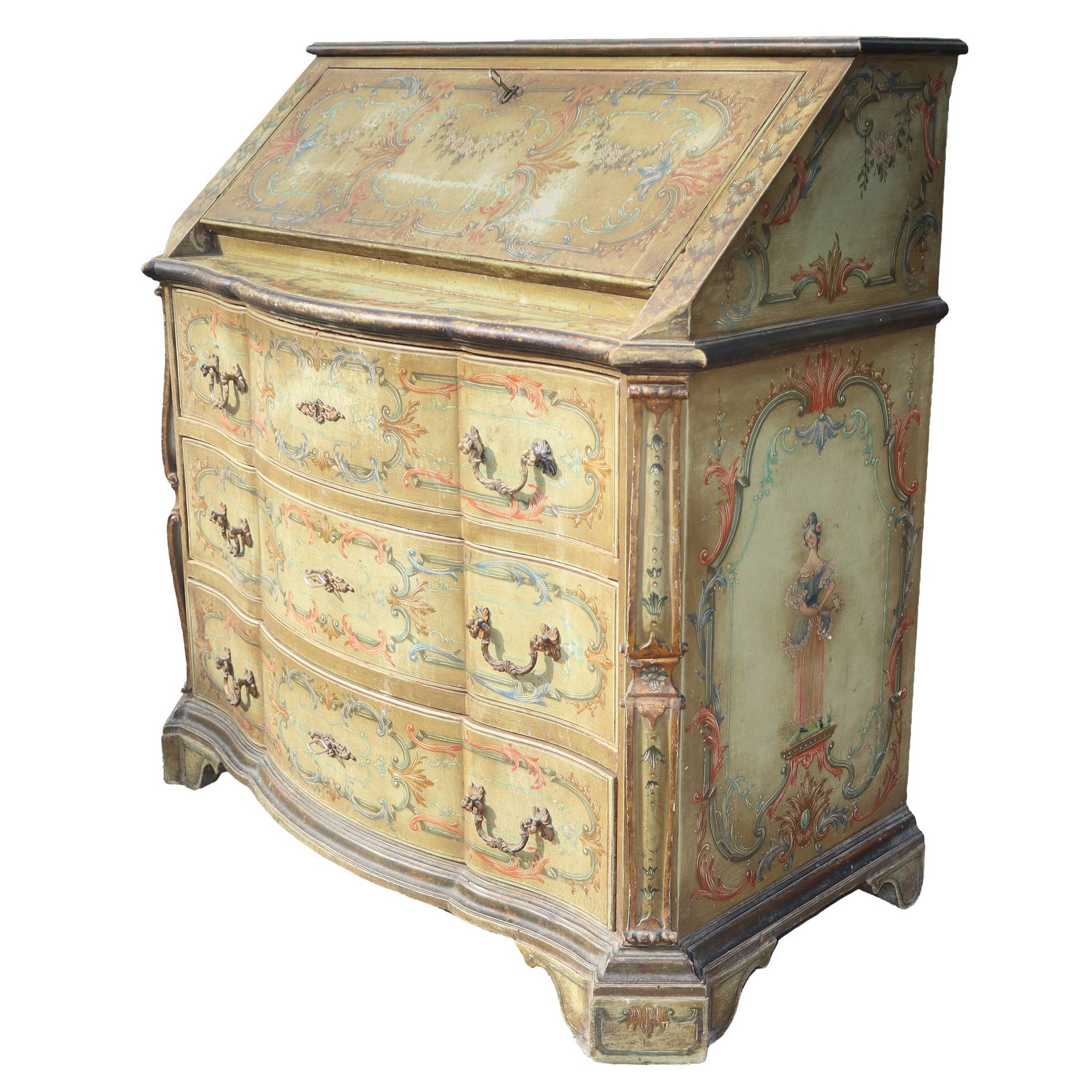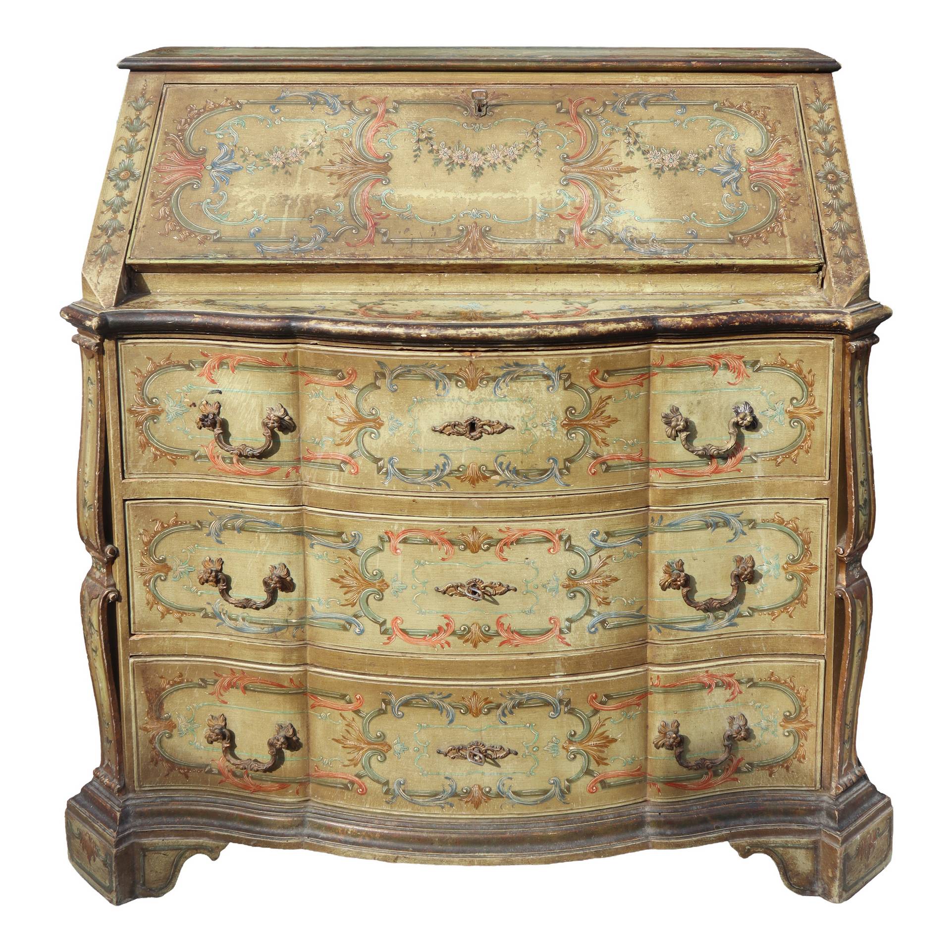 Cassettone laccato e dipinto, primi 20° secolo H cm 107x102x51 3 cassetti con alzata a ribalta 3 cassetti con alzata a