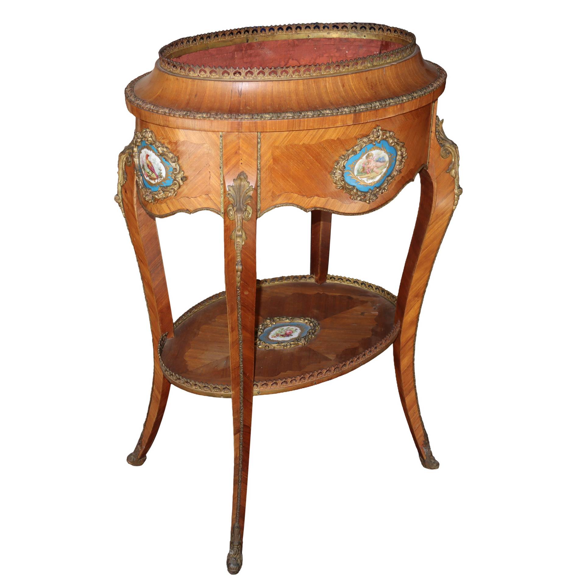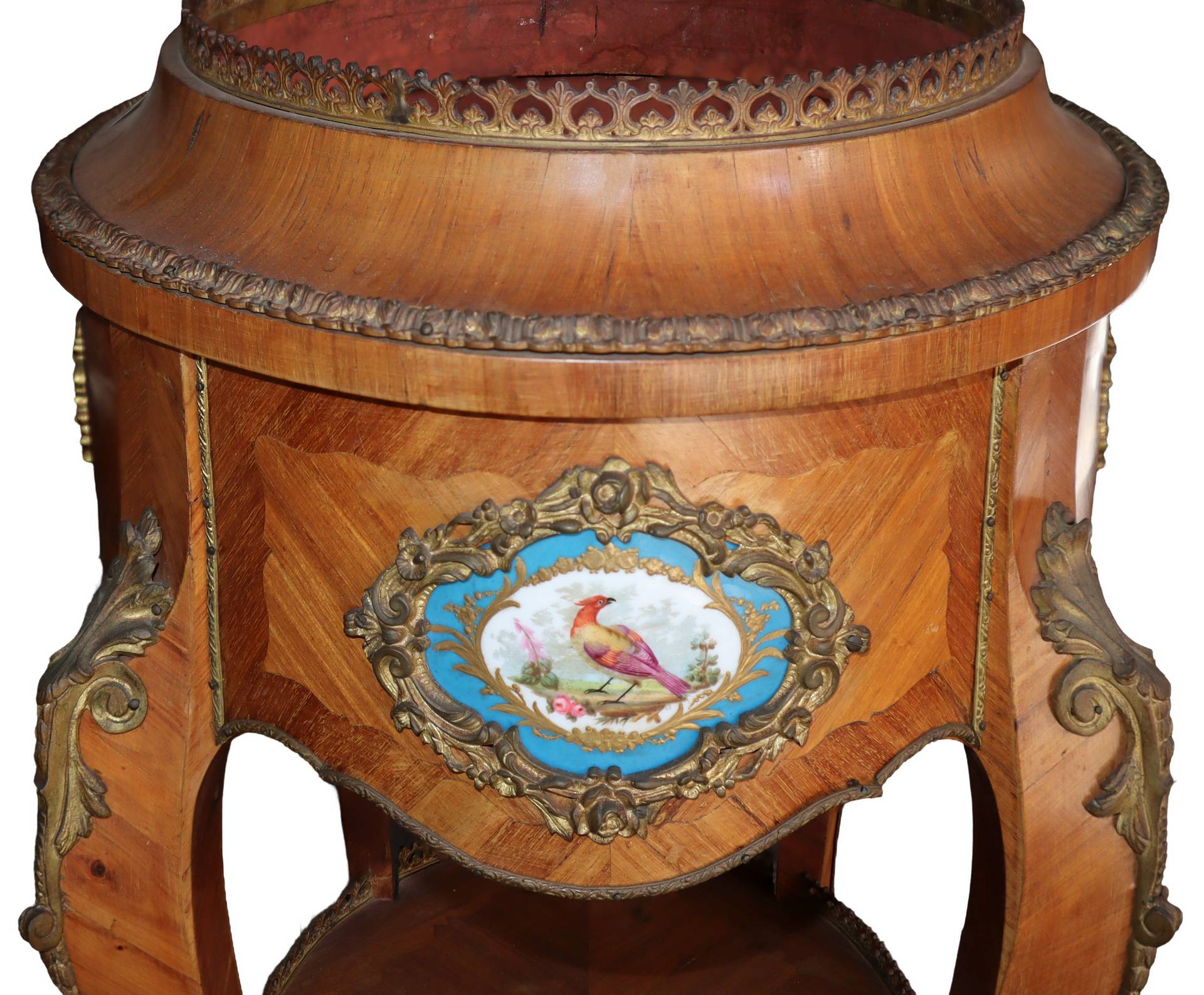 Fioriera in stile Napoleone III, in legno di rosa con porcellane e bronzi applicati, nineteen° secol