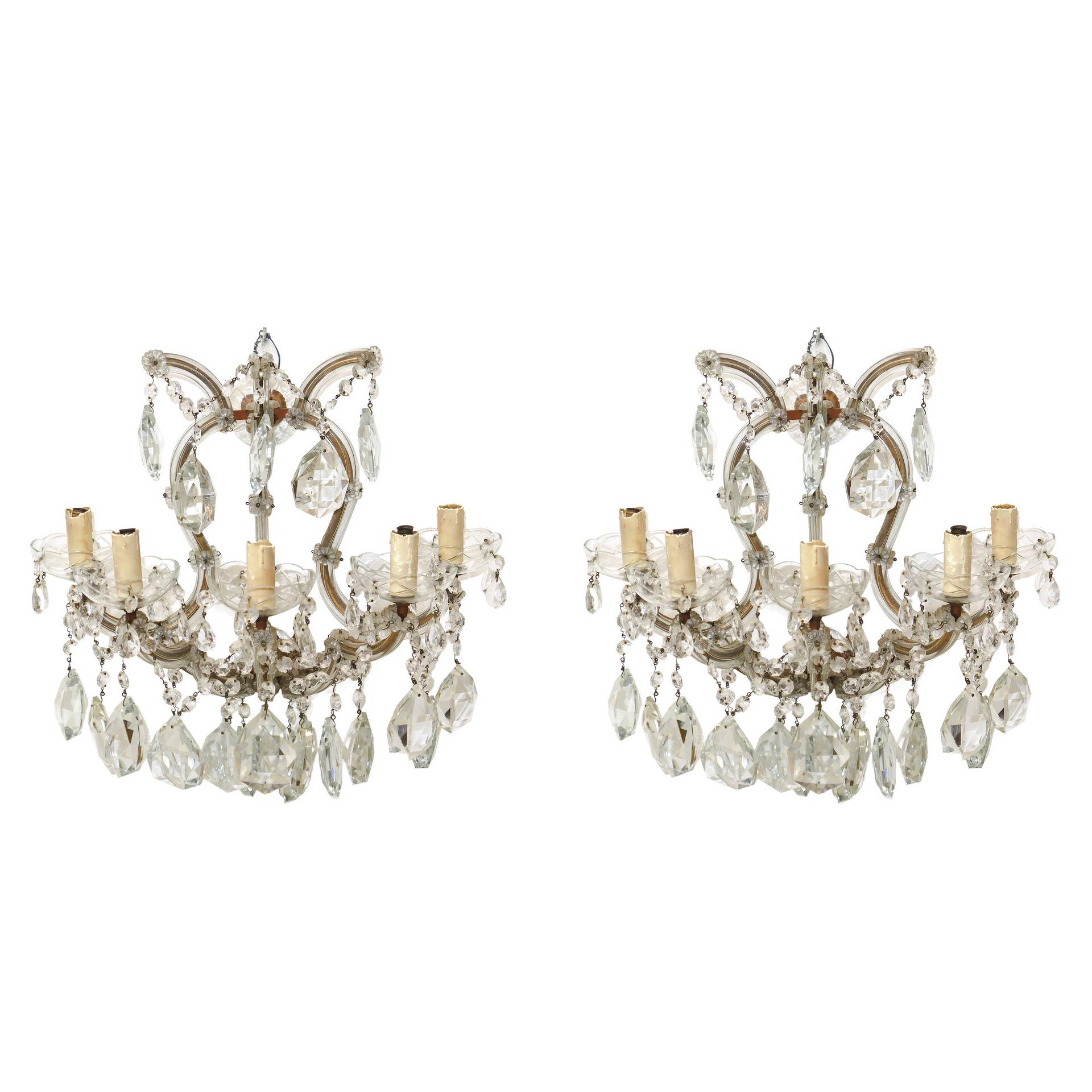 Coppia di appliques in vetro, Maria Teresa, a 5 luci con brindoli, primi 20° secolo