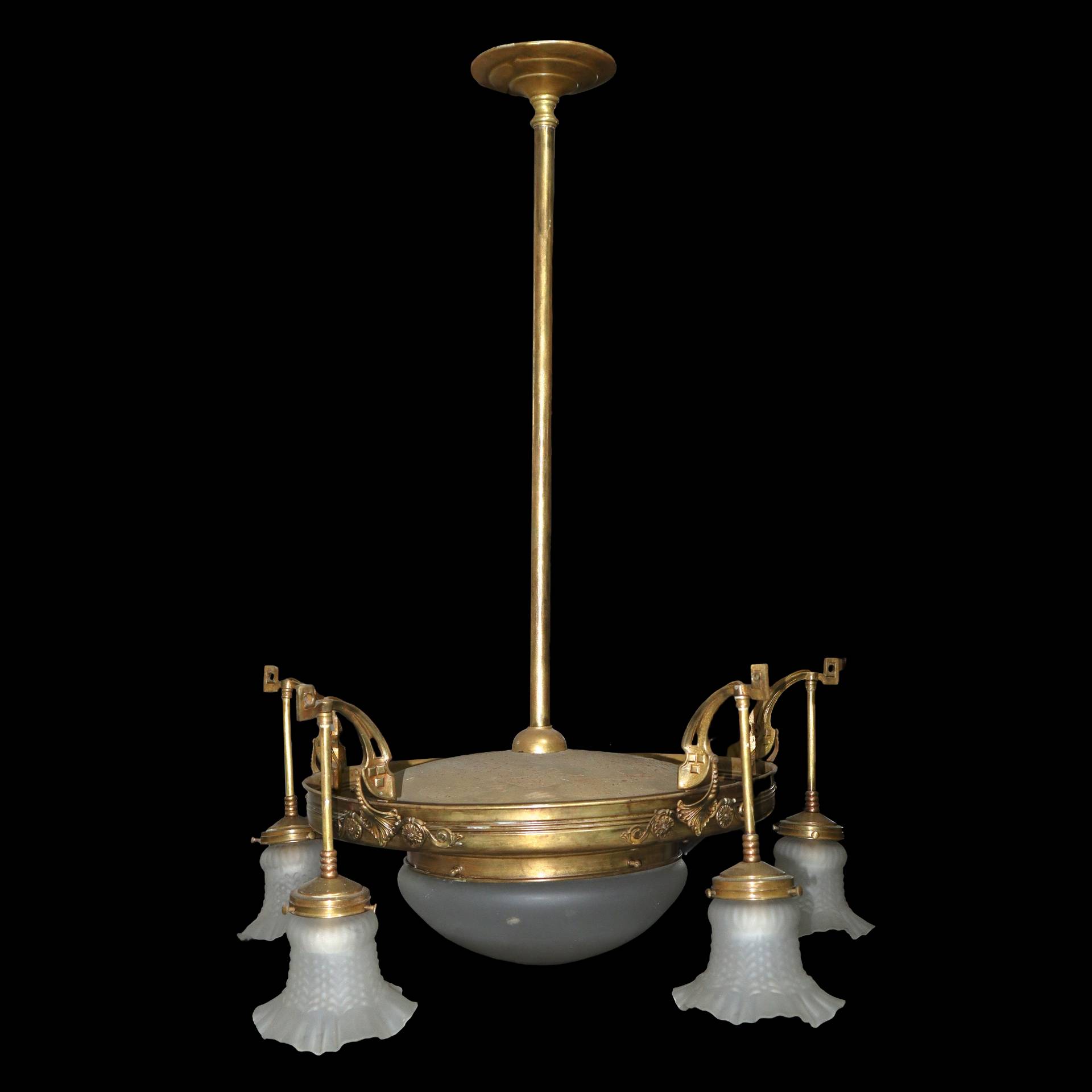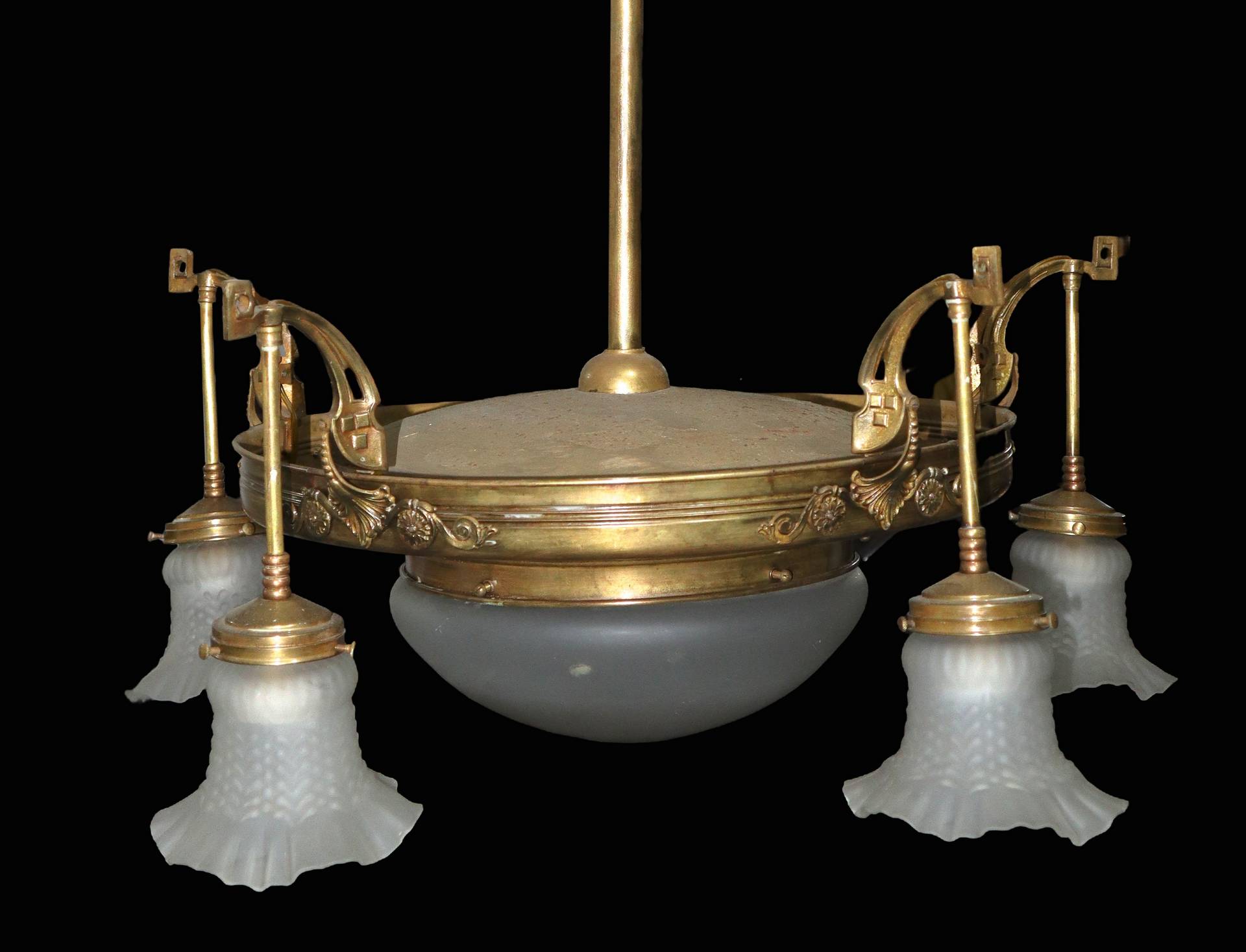 Lampadario Liberty struttura in ottone dorato 5 luci