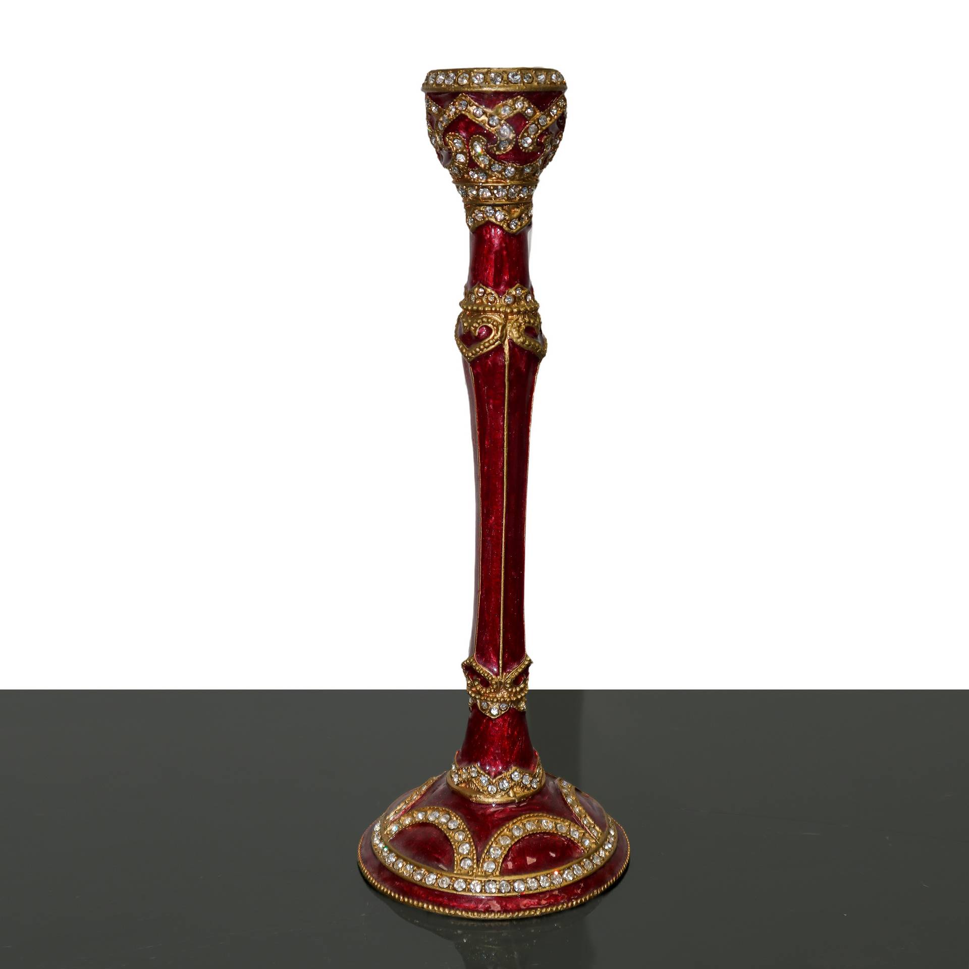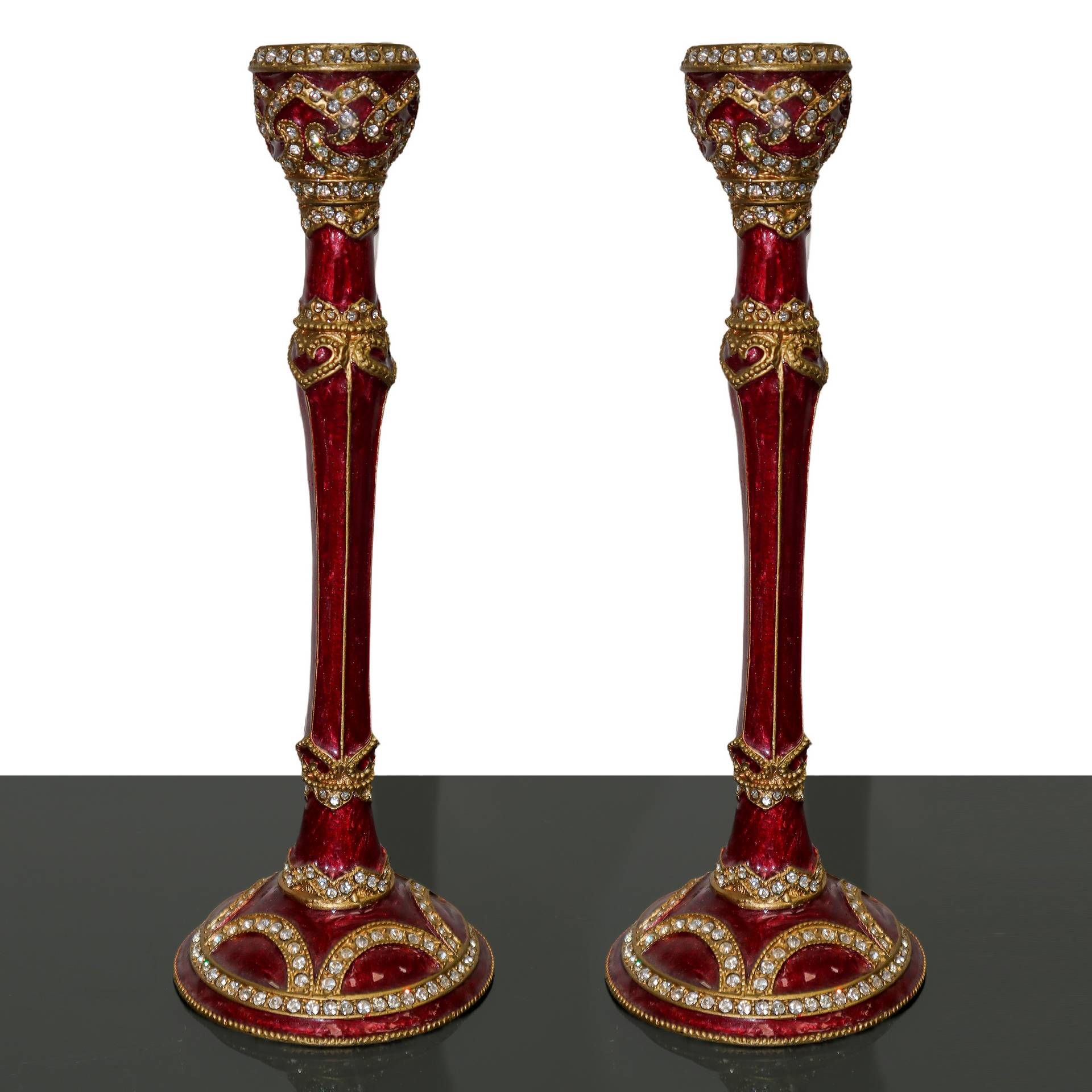 Coppia di candelieri monoforo in metallo laccato bordeaux, 20° secolo H cm 21 Con strass e decori in oroCon strass e de