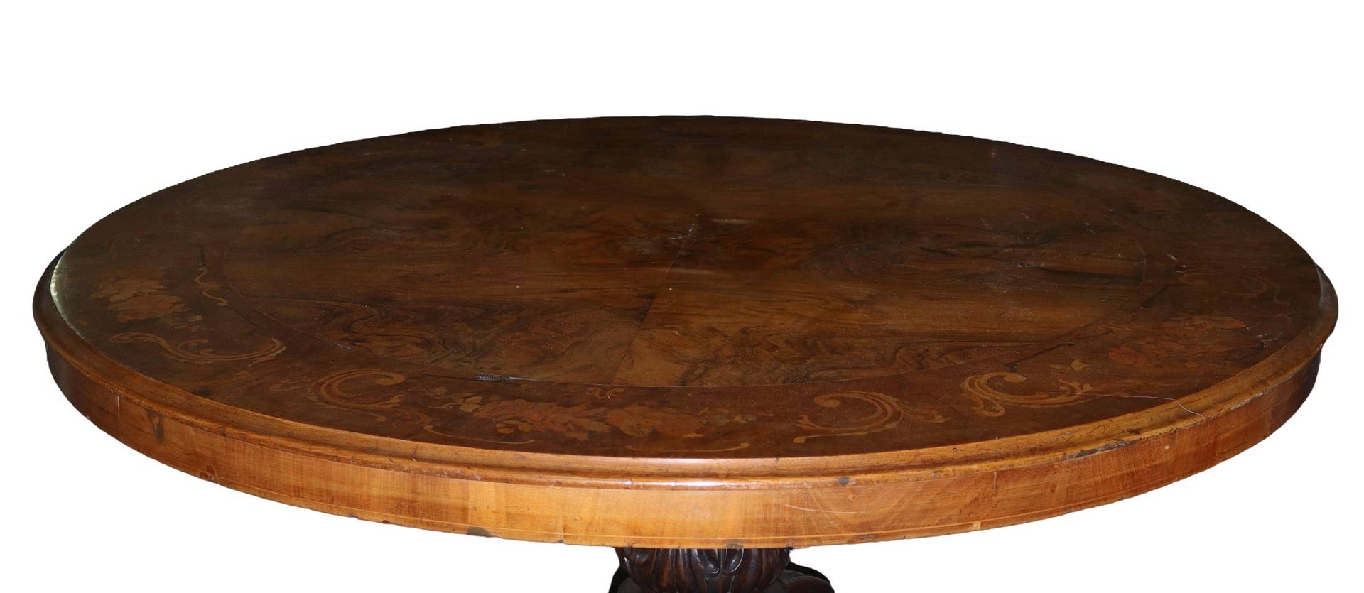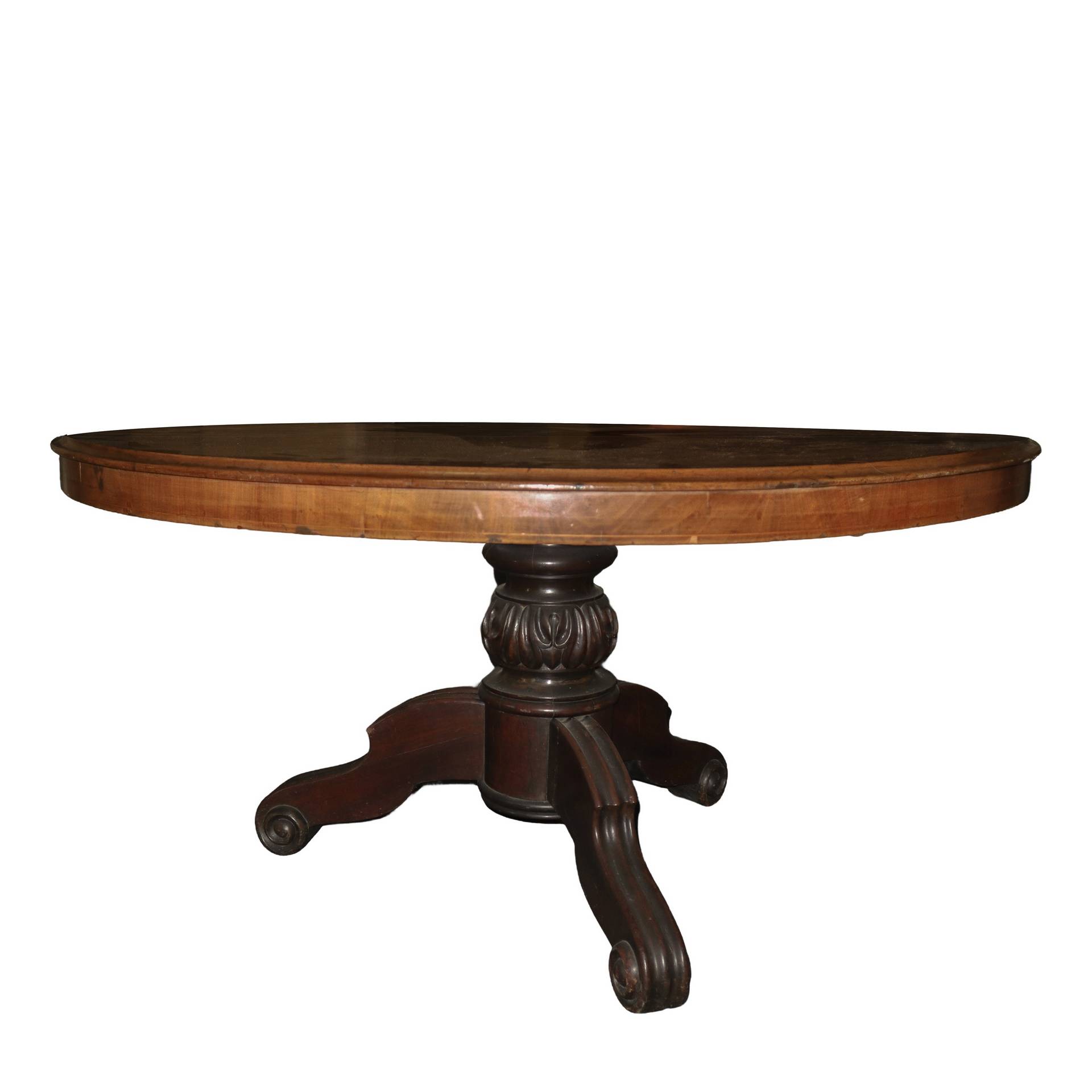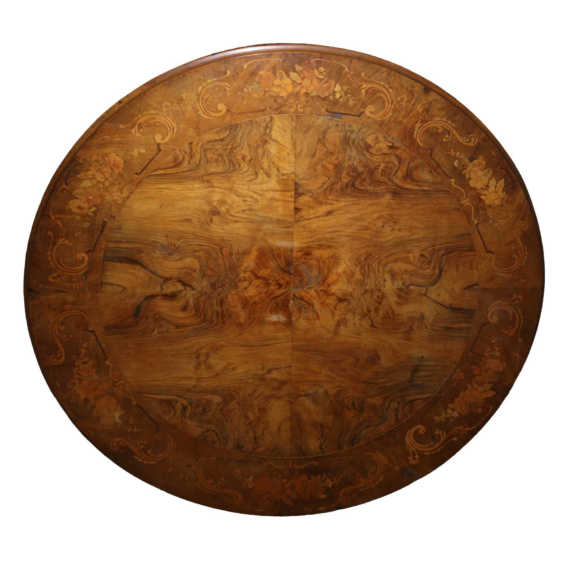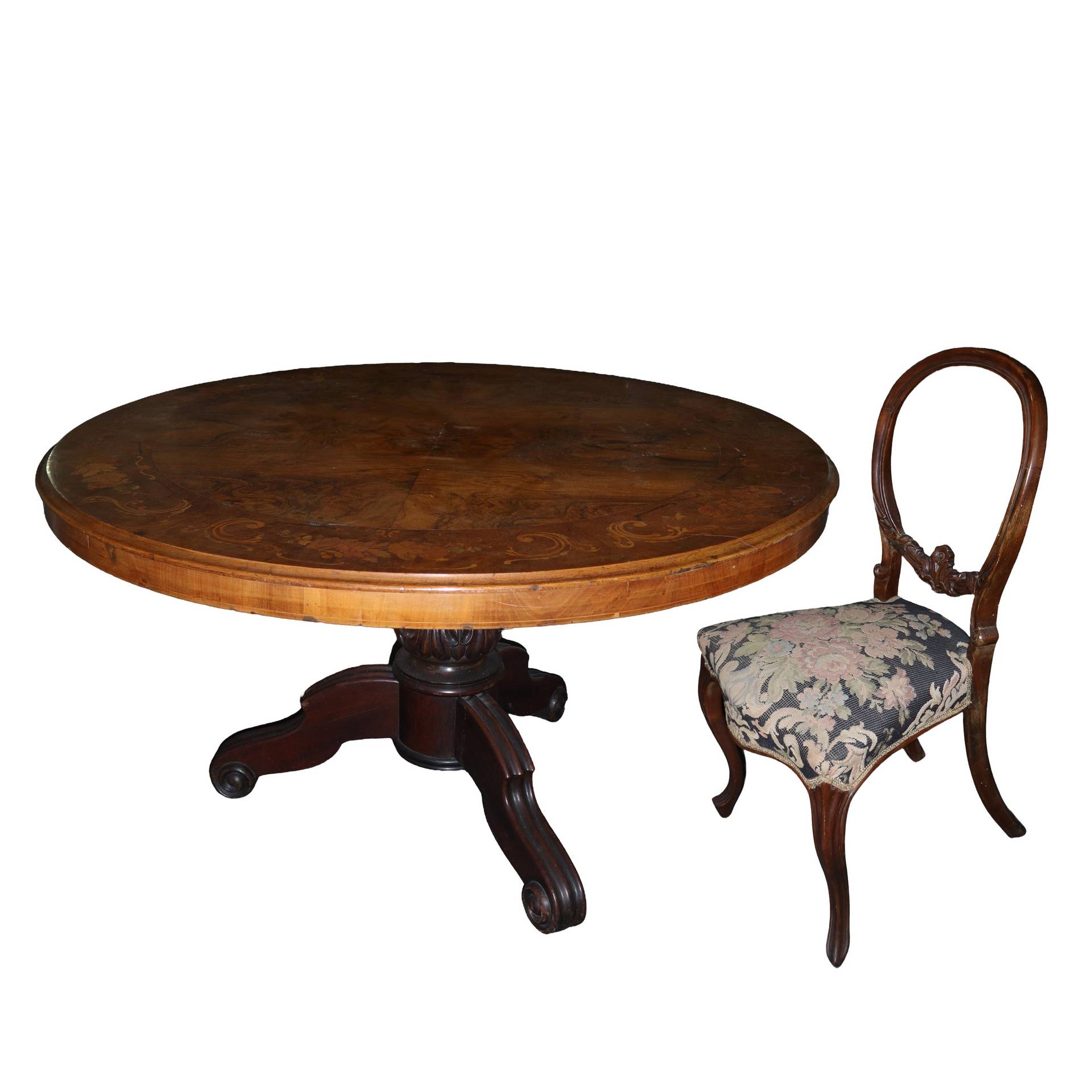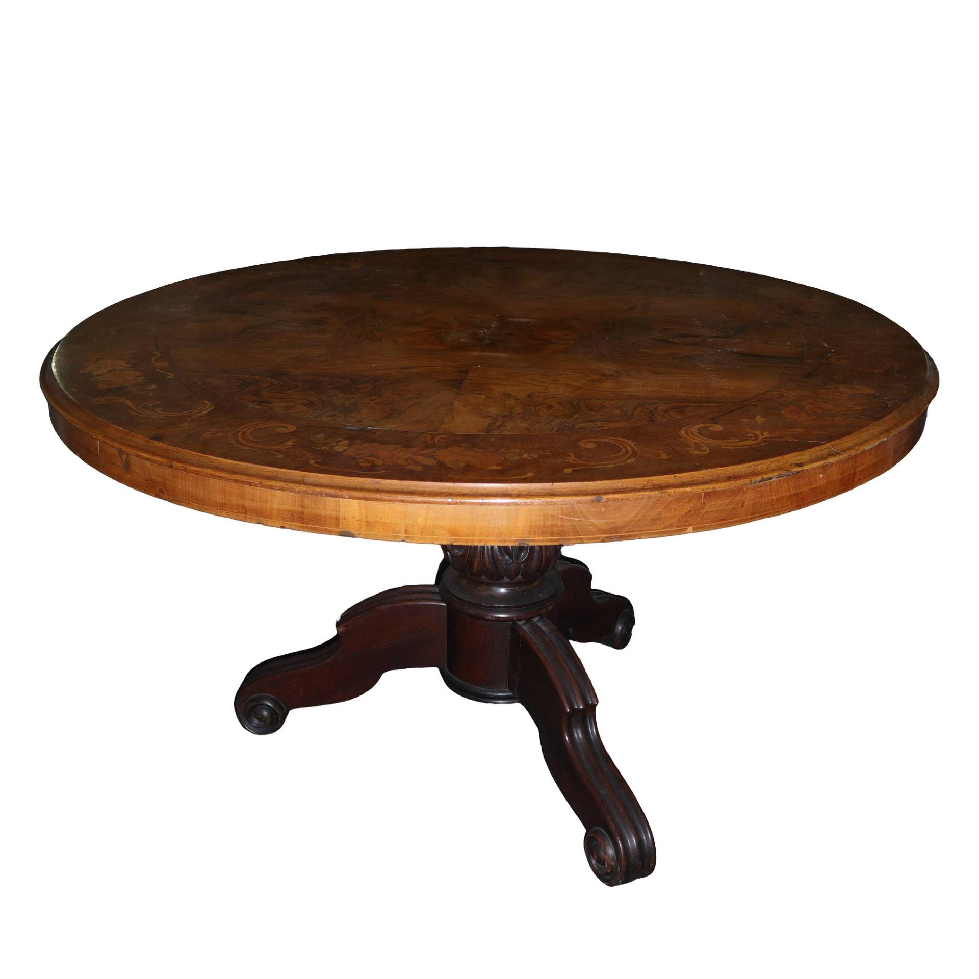 Tavolo rotondo in radica con sei sedie, 20° secolo H cm 77x136 - sedie H cm 91x47x50 Piede a tre razze.Piede a tre razz