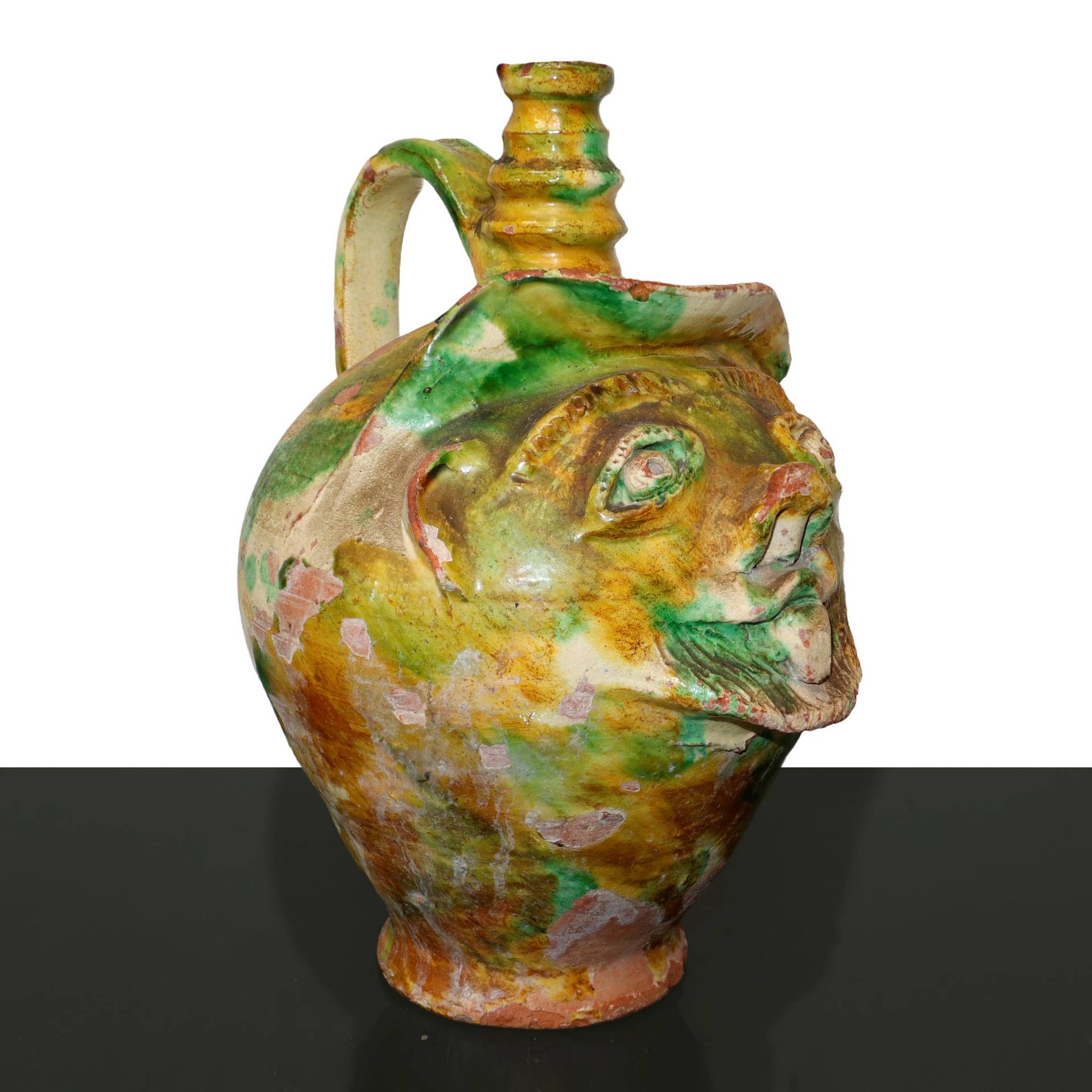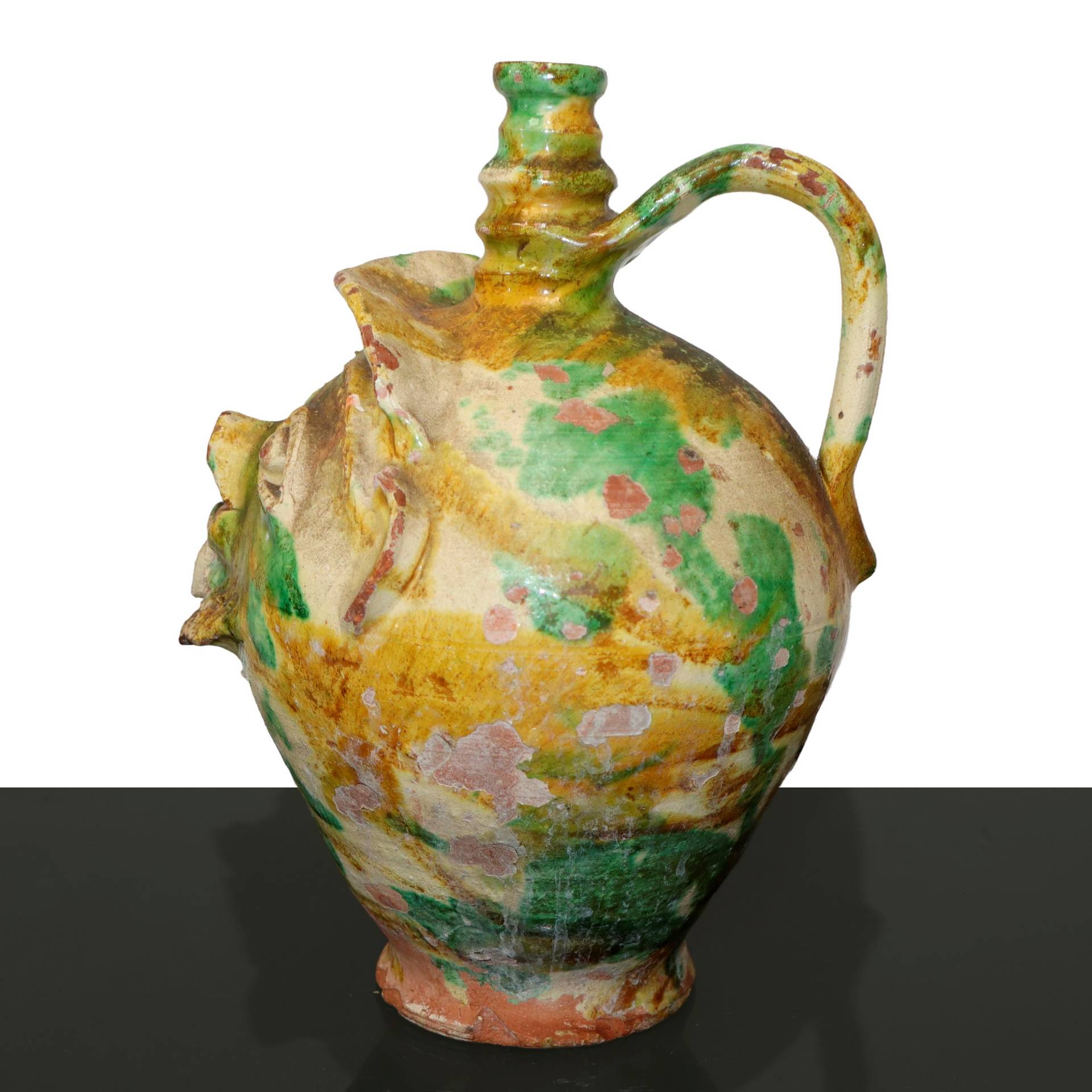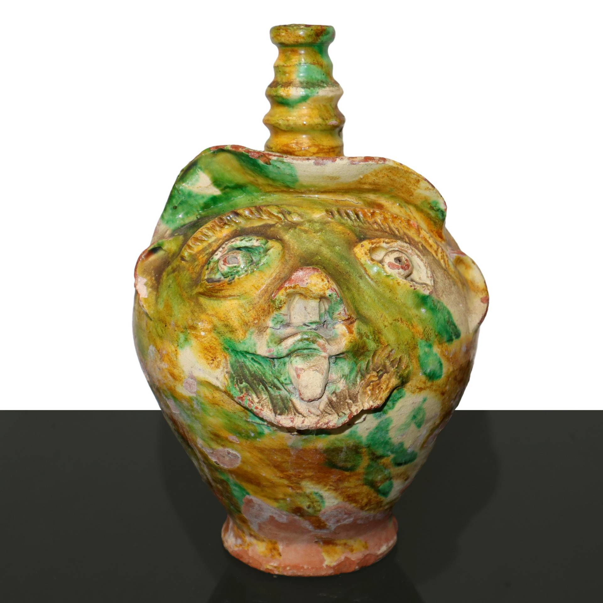 Brocca di forma antropomorfa in terracotta , Calabria, primi 20° secolo h cm 33 , larghezza max cm 33 Cadute di smalto