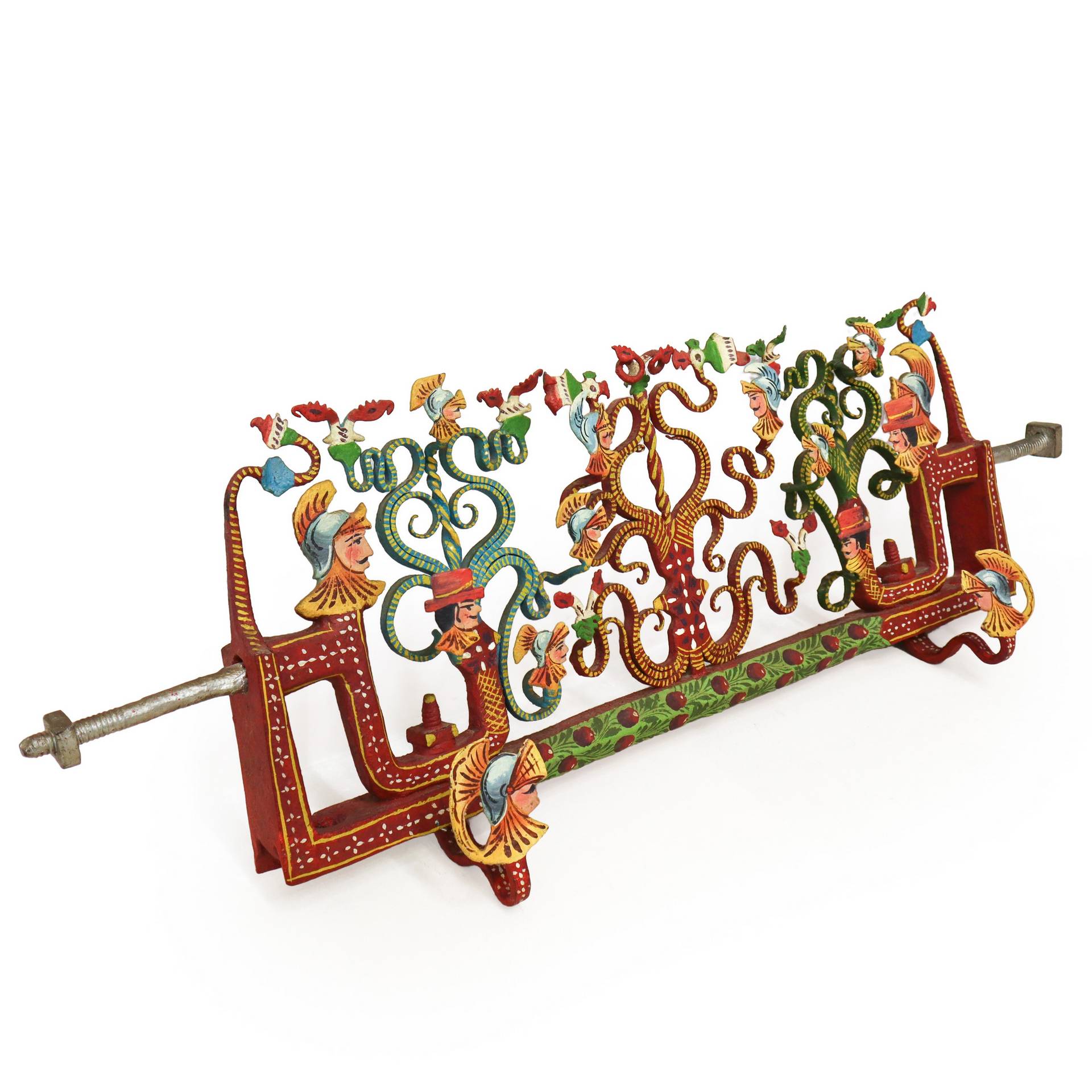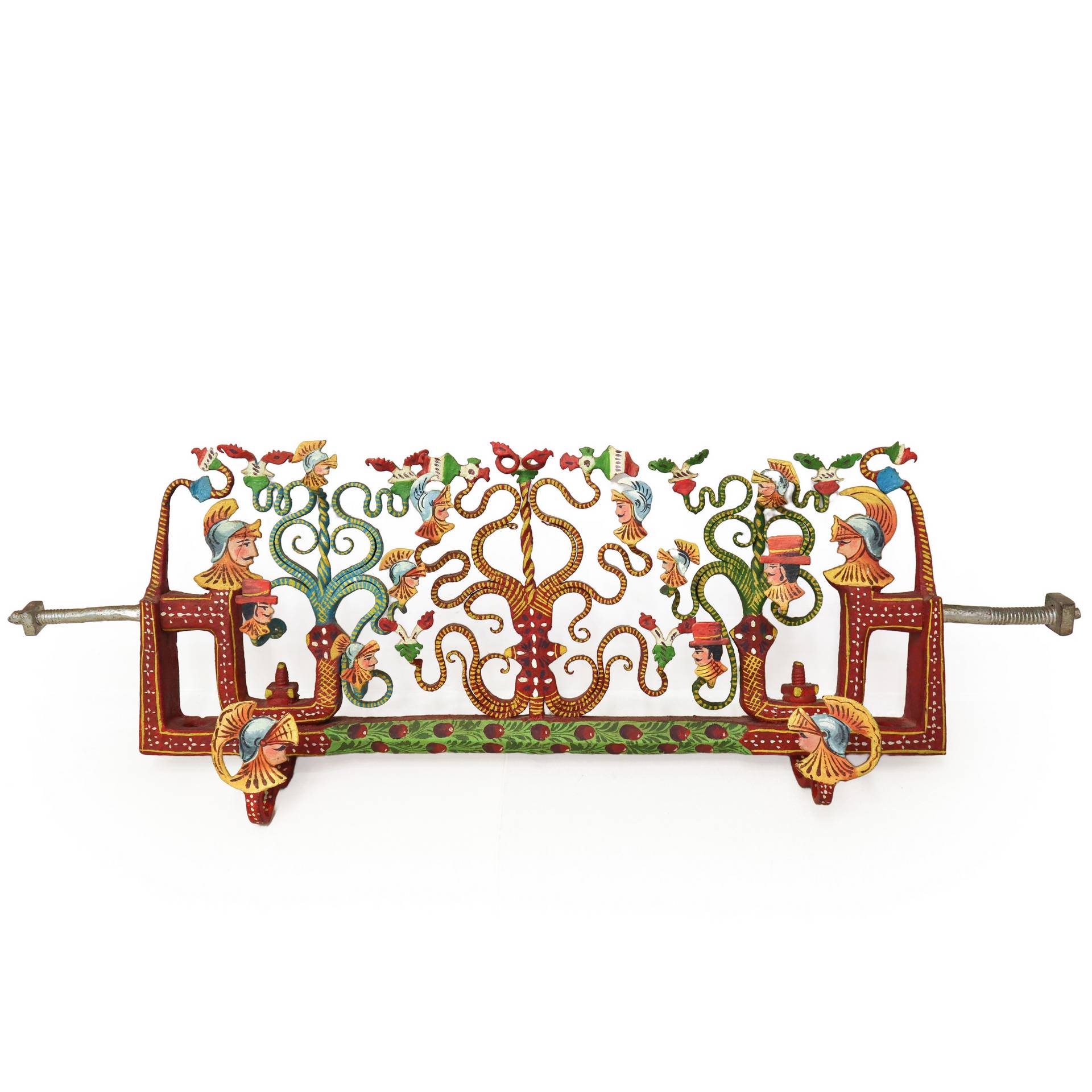 Frammento di carretto in ferro battuto con raffigurazioni di teste dei paladini di Francia.